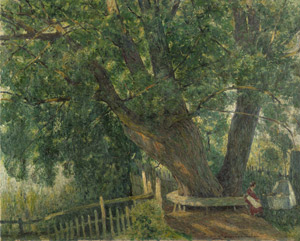 Frau mit Kinderwagen unter mächtigem Baum