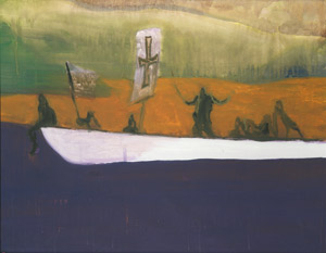 Peter Doig wurde mit dem Motiv des "Weißen Kanu" bekannt. Berühmt für seinen magischen Realismus, schöpft er häufig aus den Eindrücken seiner Kindheit in Kanada. In London absolvierte er sein Studium der Malerei, u.a. an der St. Martin's School of Art. Anschließend war er von 1995 bis 2000 tätig als Kurator an der Tate Gallery, London. Seit 2002 lebt er mit seiner Familie in der Südsee, und hat gleichzeitig seit 2005 eine Professur für Malerei an der Kunstakademie Düsseldorf inne. Seine Bilder zeigen Einflüsse durch den Symbolismus des 19. Jahrhunderts, besonders in der paradiesischen Südsee-Motivik des einsamen Menschen in der Landschaft wird ein starker Bezug zu Gauguin deutlich. Prachtvoller, wunderbar farbintensiver Druck dieser blattfüllenden Komposition, mit dem vollen Rand.
