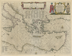 Koeman Me 164. – Die Seekarte zeigt das östliche Mittelmeergebiet, Italien mit Sizilien und Malta, den Balkan, Griechenland, Kleinasien, die Nordostküste Afrikas bis zur Ostküste des Mittelmeers mit Zypern. Die Kartusche mit holländischem und lateinischem Titel, des Weiteren mit Meilenzeiger und einer Kompassrose. Johannes Janssonius veröffentlichte die Karte erstmals in seiner fünfbändigen Ausgabe des 'Atlas Novus', dem sogenannten 'Atlas maritimus'; hier aus der lateinischen Ausgabe. – Im unteren Falz mit hinterlegtem Einriss bis in die Darstellung. Etwas gebräunt und leicht fleckig.