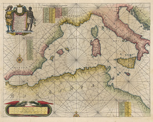 Koeman Me 164. – Die Seekarte zeigt das westliche Mittelmeergebiet, die Westküste Spaniens mit den Balearen, die Südküste Frankreichs mit Korsika, Italien mit Sardinen und Sizilien, sowie die Nordwestküste Afrikas. Die Kartusche mit holländischem und lateinischem Titel, des Weiteren mit Meilenzeiger und einer Kompassrose. Johannes Janssonius veröffentlichte die Karte erstmals in seiner fünfbändigen Ausgabe des 'Atlas Novus', dem sogenannten 'Atlas maritimus'; hier aus der lateinischen Ausgabe. – Etwas stärker gebräunt und etwas braunfleckig.