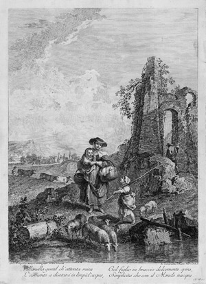 nach. Drei Flusslandschaften mit Hirtenfamilien. 3 Radierungen von Francesco Bartolozzi. Je ca. 46,2 x 33,6 cm. "Ex Calcographia I. Wagner Venis. C. P. E. S." Um 1762. Calabi/de Vesme 2454, 2456, 2462.