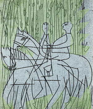 Grieshaber, HAP. Osterritt. (Text von Riccarda Gregor-Grieshaber). Mit 39 (incl. OUmschlag) meist doppelblattgr. und farbigen Orig.-Holzschnitten von HAP Grieshaber. 32,5 x 27 cm. Lose Bogen in illustr. OUmschlag und (etwas lädierter) Orig.-Papp-Kassette. Köln, Der Spiegel, 1964.