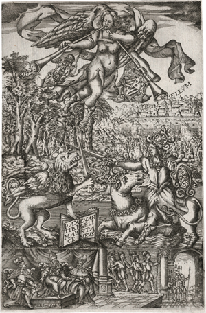 Die offenkundig unbekannte Radierung zeigt eine Allegorie auf Krieg und Frieden. Im Thieme/Becker wird ein Künstler namens Baldassare Soldi erwähnt, der durch ein 1626 datiertes Gemälde überliefert ist und möglicherweise mit unserem Künstler übereinstimmt. Ausgezeichneter, lebendiger und kräftiger Druck auf die Plattenkante geschnitten, teils mit feinem Rändchen. Unbedeutende Altersspuren, entlang des oberen Randes mit Kleberesten, sonst schönes Exemplar. Beigegeben nach Stradanus ein Kupferstich, Blatt 22, aus der Passionsfolge (New Hollstein 72).