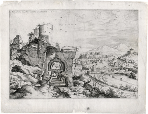 Ruinarum Palatii Maioris Prospectus (Ruinen auf dem Palatin). Radierung. 23,1 x 32,8 cm. (1550-51). Hollstein 35, J. van Grieken, G. Luyten, J. van der Stock: Hieronymus Cock. The Renaissance in Print, Brüssel 2013, Nr. 9.5. Wz. Gotisches P.