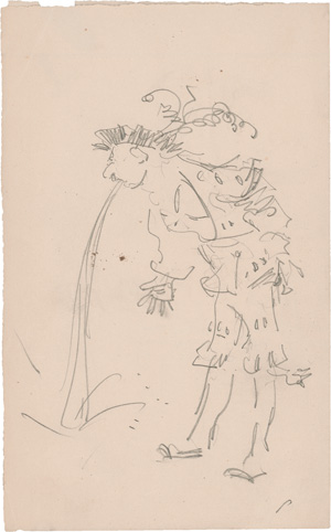 An einen "confrère à l'huile". Meldet u. a. die Erkrankung des Malers Alfred de Dreux (1810-1860), der dann auch am folgenden Tag verstarb. - Beiliegend ein gefaltetes Notizblatt (18,5 x 11,5 cm) mit einer Orig.-Bleistift-Zeichnung. Skizzenhaft dargestellt ist ein kotzender Mann in Landsknechts-Kleidung (auf einem beiliegenden Antiquariatszettel wird er für einen "Arlequin" gehalten). - Ferner beiliegend ein Foto von Pils' Grabmonument. - Der Brief auf dünnem Papier mit Randschäden.
