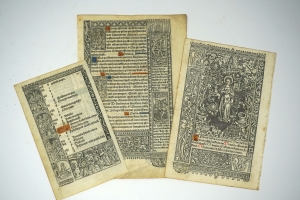 Drei gedruckte Blätter aus unterschiedlichen Stundenbüchern