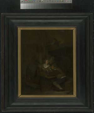 (1620-1664, Haarlem)Drei zechende Bauern und eine Frau beim Kartenspiel