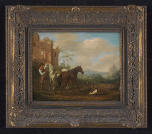 17. Jh. Reiter mit zwei Pferden und seinem Hund bei einer Ruine