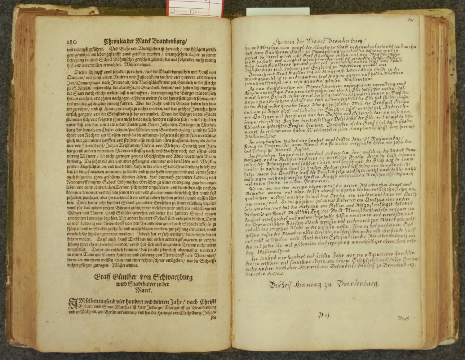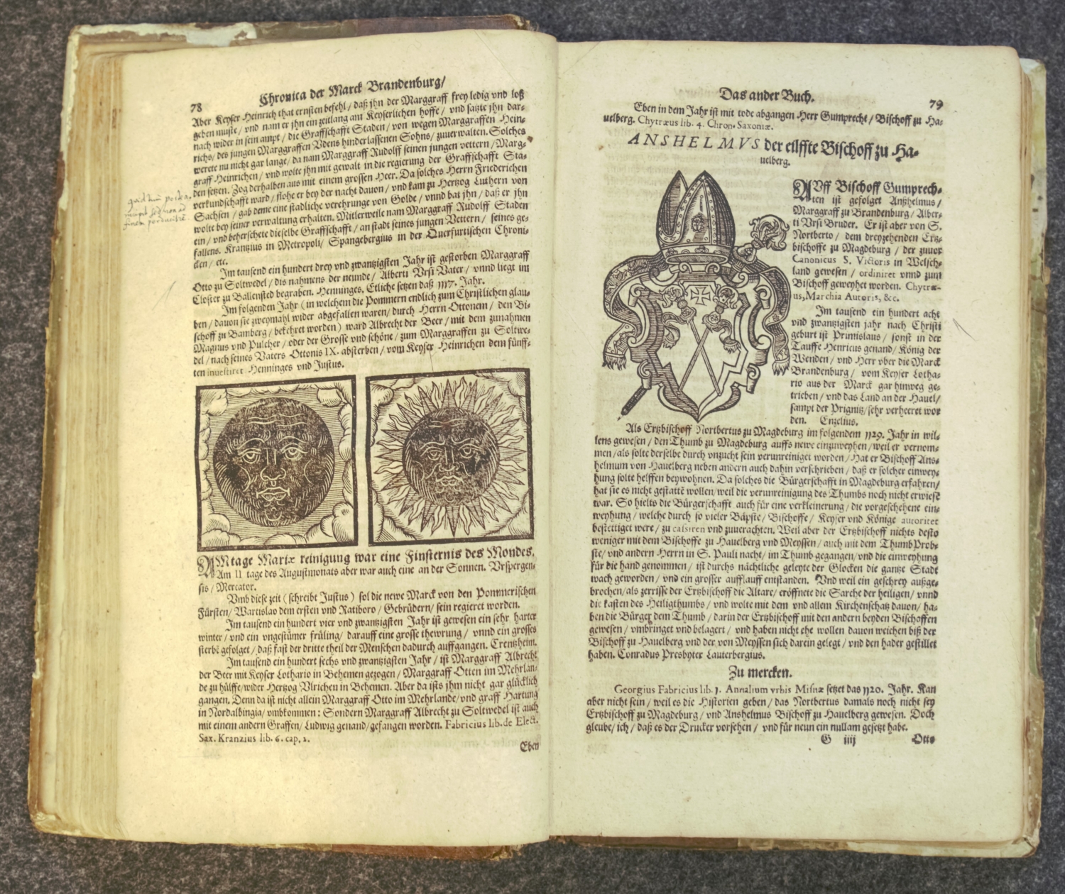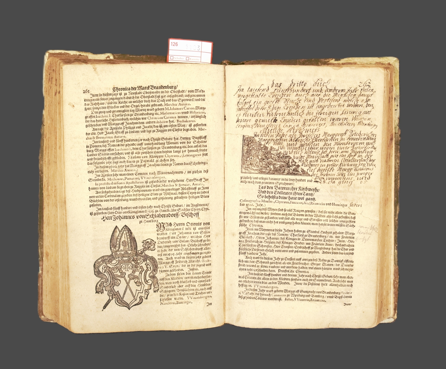 Angelus, Andreas. Annales Marchiae Brandenburgicae, das ist ordentliche Verzeichniß un Beschreibung der fürnemsten und gedenckwirdigsten märckischen Jahrgeschichten und Historien, so sich vom 416. 6 Bl., 453 S., 22 Bl. Mit Holzschnitt-Druckermarke auf dem Titel, 2 ganzseitigem Wappen-Holzschnitt, 2 gefalteten Stammtafeln, doppelblattgroßem Stammbaum, mehreren Holzschnitt-Vignetten und zahlreichen, teils wiederholdenden Textholzschnitten. Titel in Rot und Schwarz. 31 x 19 cm. Blindgeprägtes Halbpergament d. Z. (beschabt, bestoßen, mit Fehlstellen und ohne die Messingschließen) über Holzdeckel. Frankfurt Oder, Johan Hartmann, 1598.