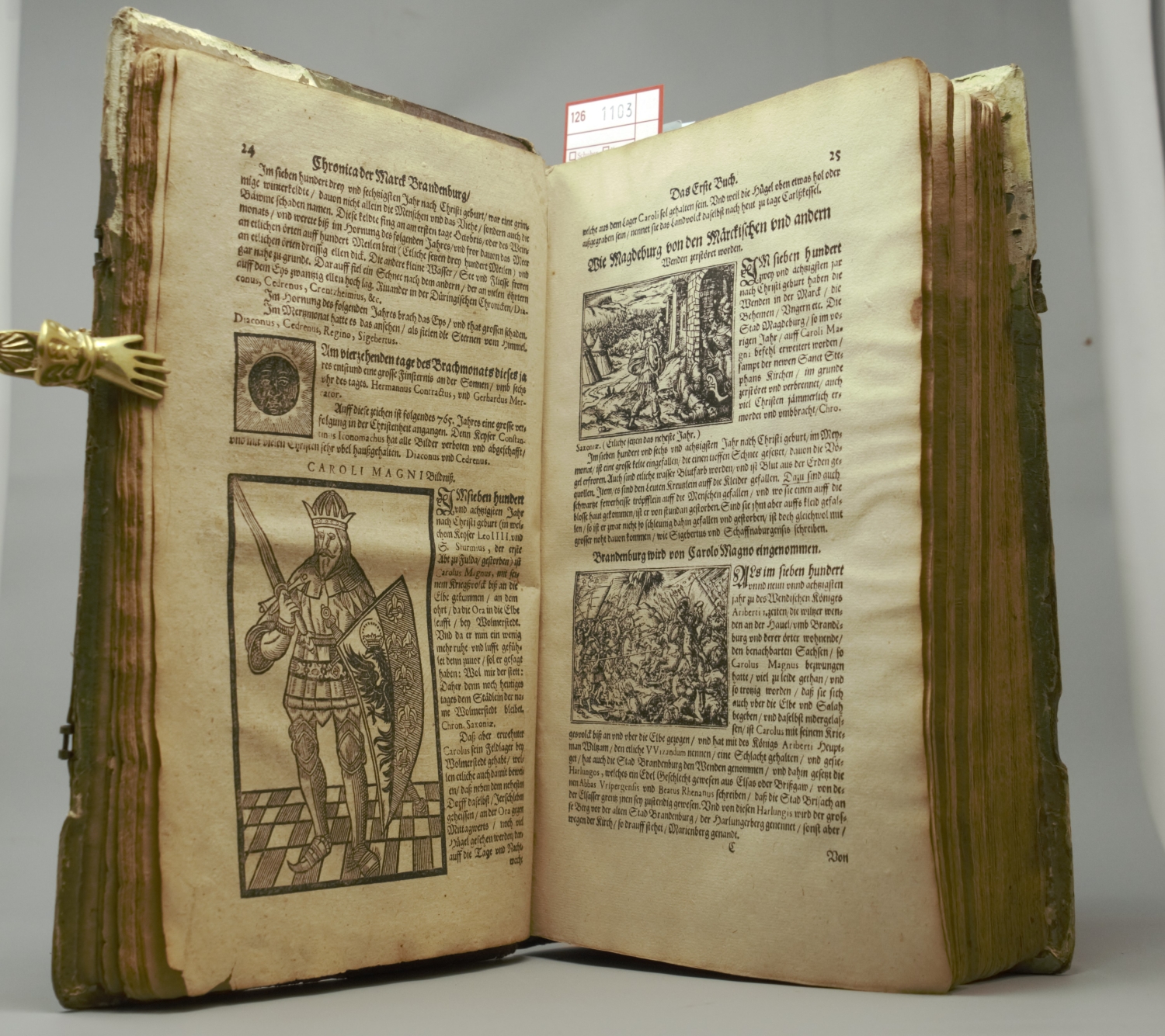 VD16, E 1181. STC 33. – Erste Ausgabe. Das Werk von dem deutschen Pfarrer Andreas Angelus (1561-1598) behandelt die Geschichte Brandenburgs von 416 v. Chr. bis 1596. – Ohne die Karte und Seite 181 bis 182 fehlt und wurde durch eine hs. Kopie der Zeit ersetzt, ebenfalls Seite 262 bis 263 mit großer Fehlstelle, die mit einer hs. Kopie der Zeit ausgebessert wurde. Seite 25 bis 26 durch eine moderne Fotokopie ersetzt. Vorderes Innengelenk offen, teilweise leicht braun- und fingerfleckig, mit kleinen Einrissen sowie knickspurig.