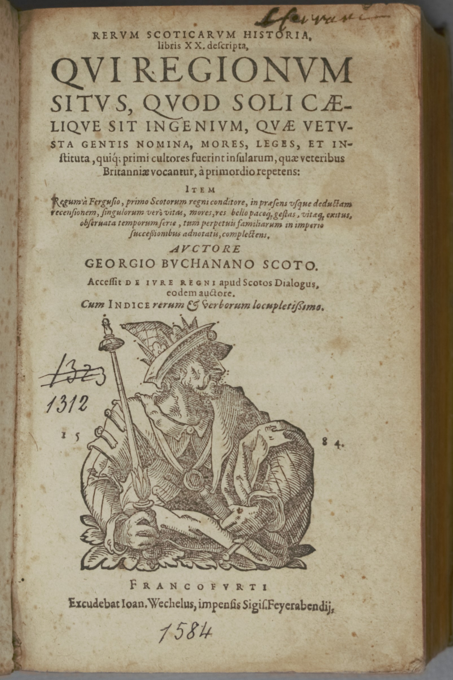 VD 16 B 8988. IA 126.489. Adams B 3057. STC 163. Fueter 173. – Erste deutsche Ausgabe und die dritte Ausgabe des erstmals 1582 in Edinburgh erschienenen Werkes. "Klassisches Werk" (Fueter) des protestantischen schottischen Humanisten Buchanan (1506-1582), eine Hauptquelle zur schottischen Geschichte des 16. Jahrhunderts bis zu Jakob VI., dessen Erzieher er war. In seinen späteren Jahren war Buchanan in wichtigen Funktionen am schottischen Hof, 1568 wirkte er an der Gerichtsentscheidung über Maria Stuart mit. Von Fueter für seinen Stil gelobt, aber wegen seiner Parteinahme heftig kritisiert: "Die ältere Geschichte ist das Werk eines extremen Nationalisten, die Zeitgeschichte das eines schroffen Parteimannes. Die Darstellung der jüngsten Vergangenheit ist nichts anderes als eine gehässige und in den Einzelheiten durchaus nicht zuverlässige Anklagerede gegen Maria (Stuart) und die Hamiltons." – Titel mit hs. Besitzvermerk und Ziffernsignatur, am Schluss mit Wasserrand. Etwas gebräunt und leicht stockfleckig, erste Lagen in der oberen rechten Ecke etwas gestaucht.