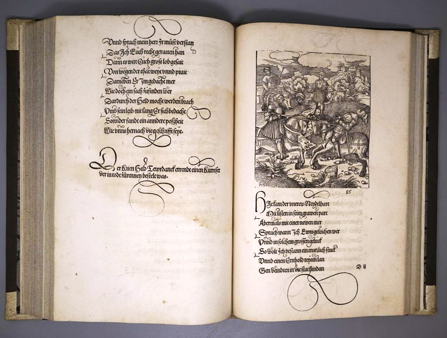 VD16 M 1651. Adams P 963. Fairfax-Murray 330. Lipperheide Cg 12. Dodgson I, 509, 19 und II, 58, 7. Oldenbourg L 120. Hollstein V, 112. Brunet V, 767f. – Zweiter Druck der zweiten Auflage des wohl aufwendigsten deutschen Holzschnittbuches des 16. Jahrhunderts. Während der erste Druck von 1517 von Kaiser Maximilian I. bekanntlich fast ganz zu Geschenkzwecken gebraucht wurde, war die vorliegende zweite Auflage ausschließlich zum Verkauf bestimmt. Für das von Maximilian in Auftrag gegebene und von dem Nürnberger Probst Melchior Pfintzing (1481-1535) poetisch gestaltete Werk, wurde eigens eine Drucktype mit ornamentalen Ober- und Unterschleifen aus der damaligen Kanzleischrift entwickelt, die als Vorläufer der Fraktur gilt (vgl. Arnim, Fünf Jahrhunderte Buchillustration, 70). Das vom kaiserlichen Sekretär Treitzsaurwein geordnete Werk erzählt allegorisch unter der Handlung einer Brautfahrt die Lebensgeschichte des Kaisers Maximilian I., sowie von Turnieren und Festlichkeiten des ausgehenden Mittelalters, welche mit diesem Werk eine kategorische quasi romantische Wiederbelebung erfuhr. – Das leere Blatt P5 fehlt, D1 und D8 verso mit Wasserfleck, keine anderen Blätter betroffen. Blatt a4 vor a3 gebunden. Lediglich 27 der Holzschnitte wurden meist in Violett, selten in anderen Farben ankoloriert, möglicherweise sollte das ganze Exemplar koloriert werden. Durchgehend etwas wurmlöchrig (minimaler Text- und Darstellungsverlust), teils stärker finger- und braunfleckig. Blätter ab und an gebräunt. Der Titel und 7 weitere Blätter hinterlegten Ein- und teils auch Ausrissen. Breitrandig beschnitten, bis auf den Kopfsteg, dieser selten mit minimalem Verlust der oberen Schriftschnörkel.