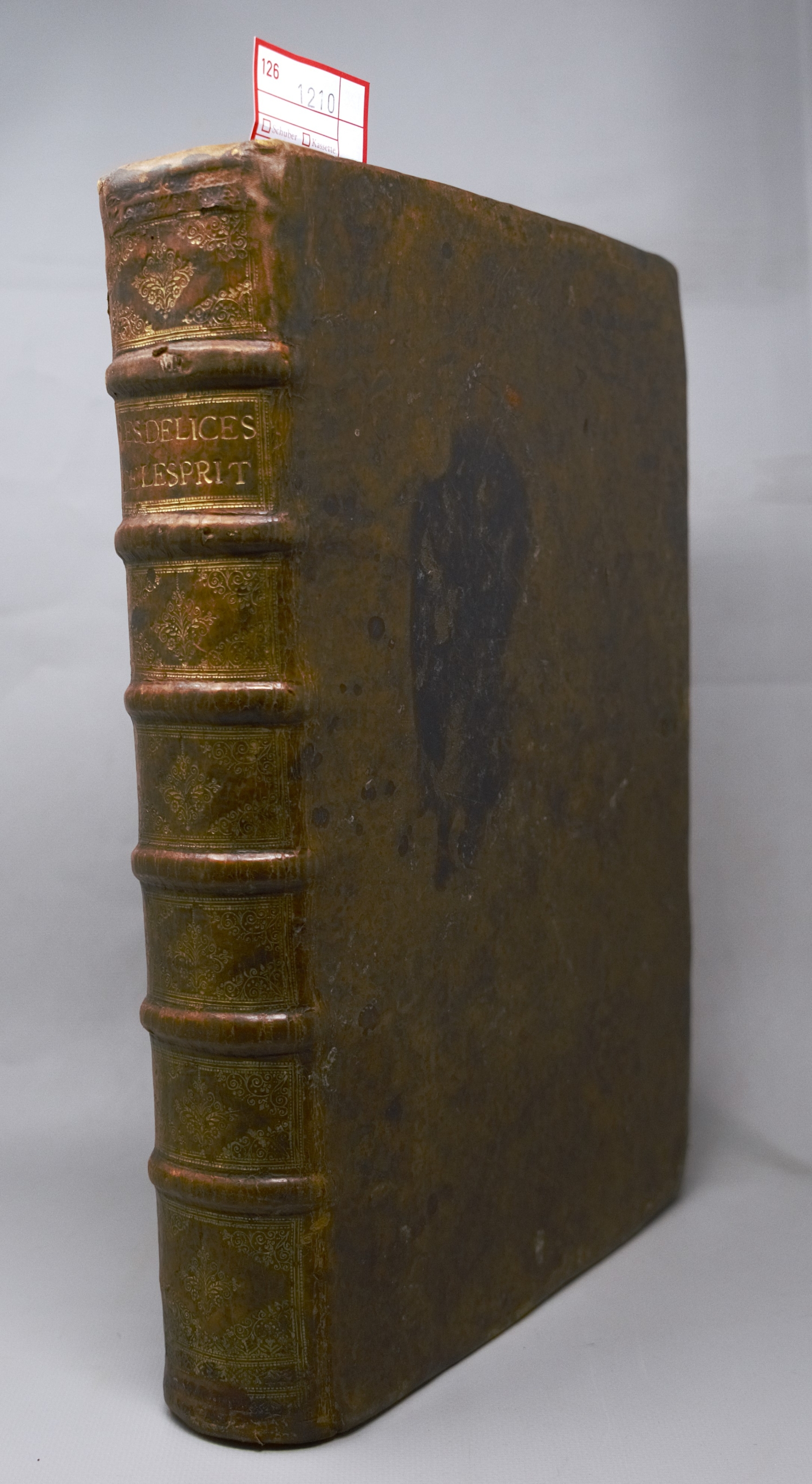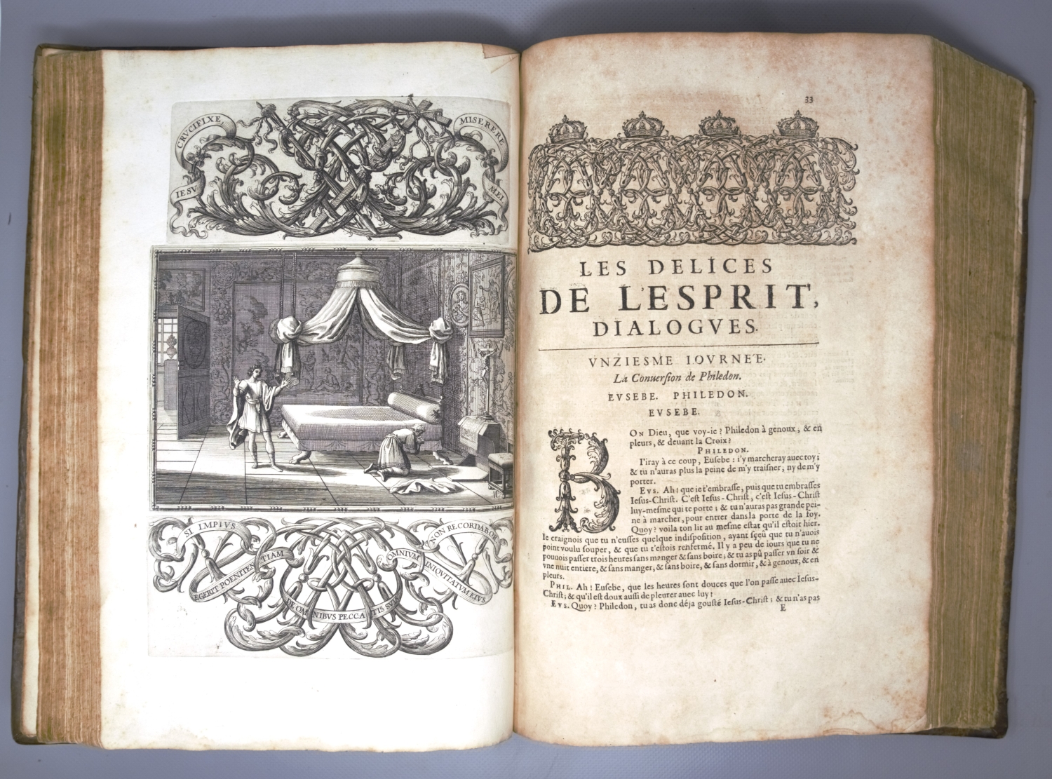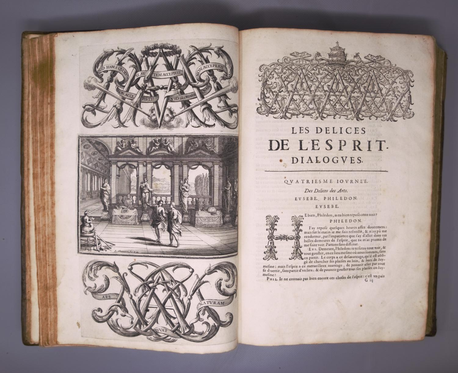 Desmarets (de Saint-Sorlin, Jean). Les délices de l'esprit. Dialogues dediez aux beaux esprits du monde. 4 Teile in 1 Band. Mit 4 Kupfertiteln, 18 Kupfertafeln und zahlreichen Holzschnittvignetten. 35,5 x 23 cm. Marmoriertes Leder d. Z. (leicht berieben und etwas fleckig) mit goldgeprägtem RTitel und RVergoldung. Paris, Florentin Lambert, 1661.