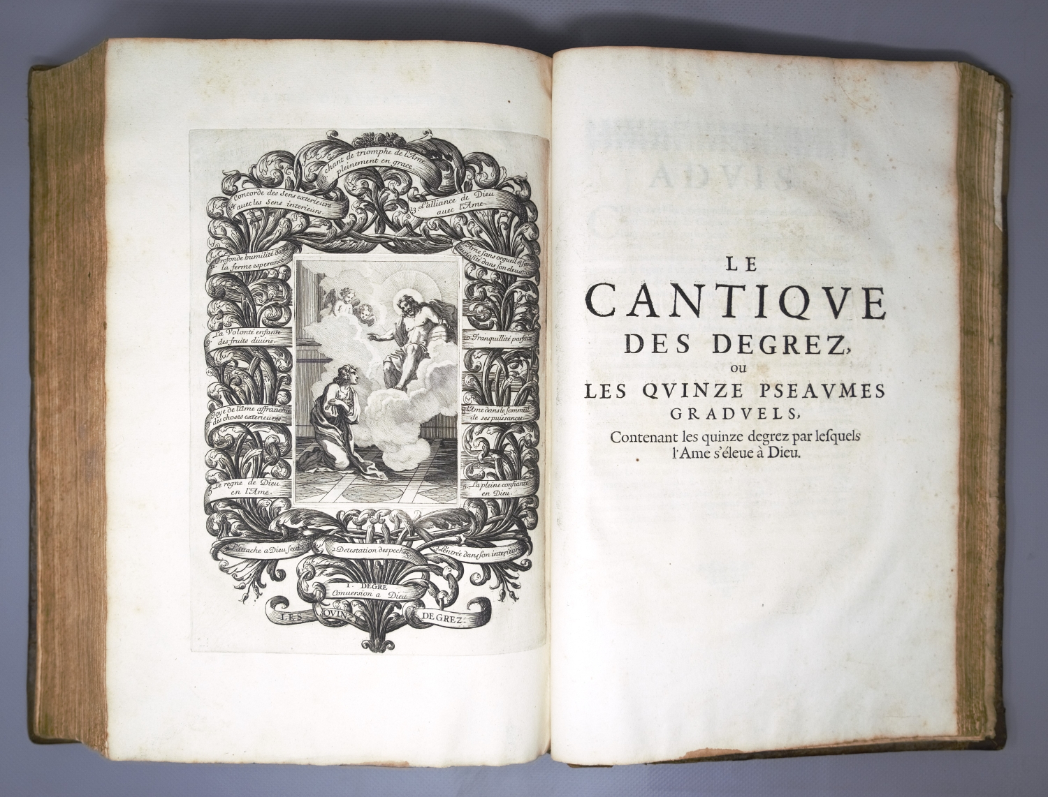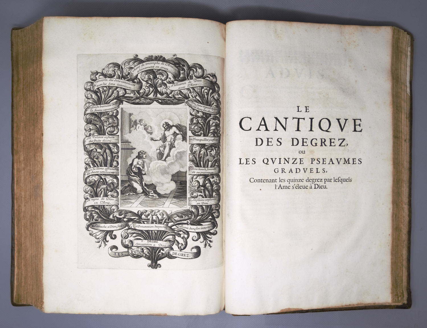 Brunet II, 635. Landwehr 258. Tchemerzine, Livres à figures, 117. Vgl. Hofer XIII, 846. – Zweite Ausgabe, die erste erschien 1658. Hauptwerk des Dichters und ersten Kanzlers der Académie Française, Jean Desmarets de Saint-Sorlin (1595-1676), in dem er "bildhaft den Aufstieg der Seele zu Gott und die Wonnen des gottgeweihten Lebens beschreibt (LThK III, 225). Saint-Sorlin war ein Günstling von Kardinal de Richelieu, auf dessen Anregung hin, er zahlreiche dramatische Stücke verfasste. – Der Kupfertitel von Teil I verso mit altem tektierten Widmungsvermerk. Innenspiegel mit hs. Signatur. Teils etwas feuchtrandig, gelegentlich leicht gebräunt, wenige Blätter des vierten Teils stark gebräunt, leicht braun- und stockfleckig sowie wenige nachgedunkelte Feuchtigsflecke.