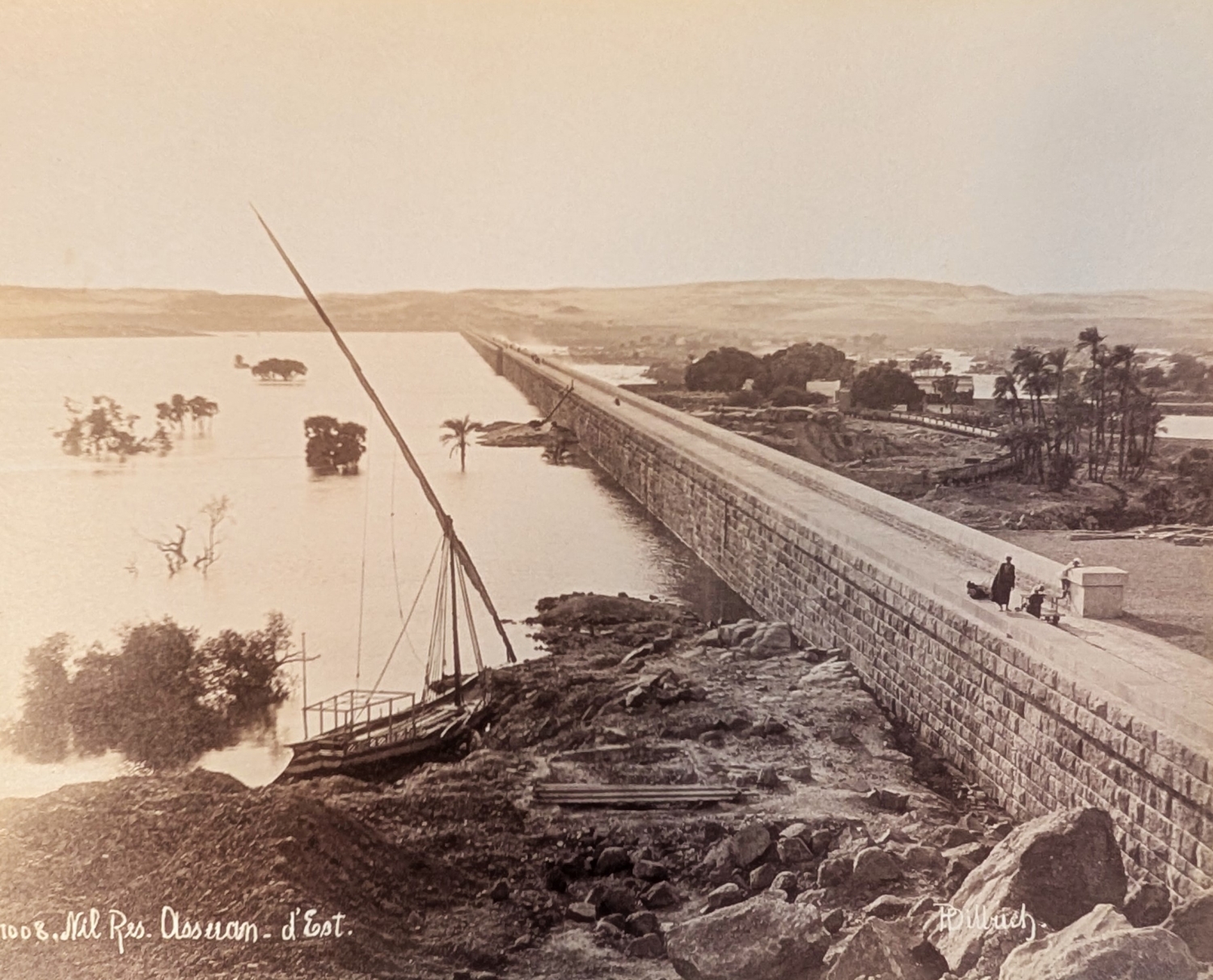 Schweres, sehr repräsentables Souveniralbum mit Ansichten aus Ägypten mit den hinlänglich bekannten Kulturstätten des Alten Ägypten, einleitend zwei Panoramansichten von Kairo, mit spärlicher Staffage (da mal ein Mensch, dort mal ein Kamel). Alle Abzüge auf schweren, grauen Untersatzkarton gewalzt und mit Angabe der seinerzeit für ihre Ägyptenfotografien namhaften Jean Pascal Sebah (1872-1947) bzw. Paul Dittrich (1868-1939) sowie Bezeichnung (auf Französisch) in der Platte, daher spiegelverkehrt. – Sehr gut erhalten.