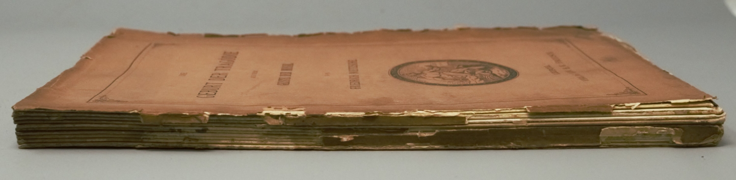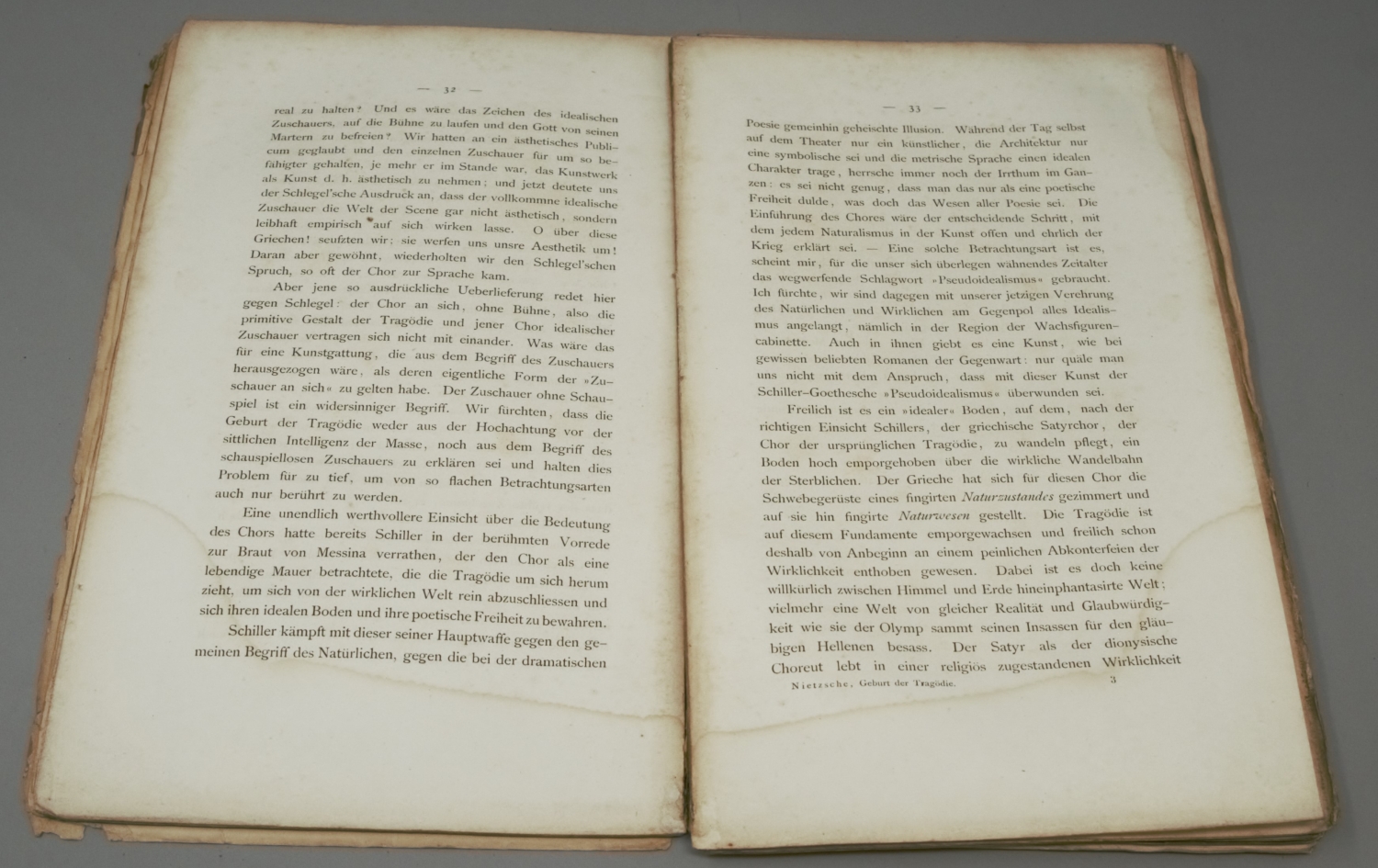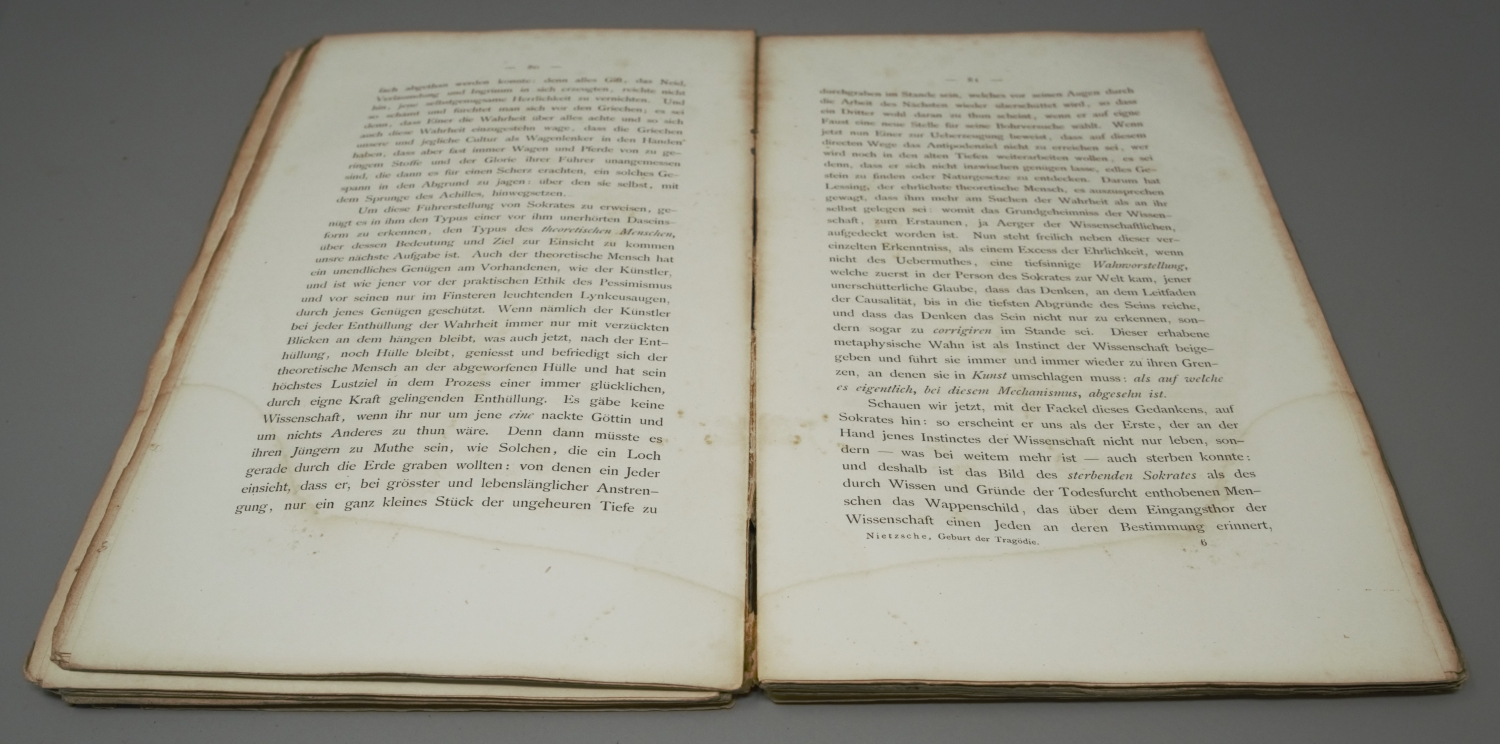 WNB 25. – Erster Druck der erweiterten Fassung. Nach Abschluss des Zarathustra konnte sich Nietzsche der Neuausgabe und Überarbeitung bereits erschienener Werke widmen. So veranstaltete er mit seinem wiedergewonnenen Verleger Fritzsch unter Verwendung noch vorhandener Restbogen sogenannte Titelauflagen. Bei Die fröhliche Wissenschaft und Die Geburt der Tragödie wurden jedoch nicht nur die Titelblätter erneuert, Nietzsche verfasste zudem bedeutende Vorreden, die hier erstmals im Druck erschienen. Seine wirkungsmächtige Basler Frühschrift über das Dionysische und das Apoollinische erschien zuerst im Mai 1872. "Unter dem Zauber des Dionysischen schließt sich nicht nur der Bund zwischen Mensch und Mensch wieder zusammen: auch die entfremdete, feindliche oder unterjochte Natur feiert wieder ihr Versöhnungsfest mit ihrem verlorenen Sohne, dem Menschen." Nietzsches Schrift über Entstehung und Niedergang der griechischen Tragödie wurde von der etablierten Philologie aufgrund seiner intuitiven und irrationalen Schlüsse nicht ernst genommen und weitgehend ignoriert. Lediglich der junge Wilamowitz-Möllendorff, mit dem Nietzsche gemeinsam in Schulpforta die Schulbank drückte, wagte einen öffentlichen Tadel: "herr Nietzsche tritt ja nicht als wissenschaftlicher forscher auf: auf dem wege der intuition erlangte weisheit wird teils im kanzelstil, teils in einem raisonnement dargeboten, welches dem journalisten nur zu verwandt ist." Erwin Rohde sprang seinem Freund Nietzsche zur Seite und veröffentlichte seine Erwiderungsschrift Afterphilologie, in der er Nietzsches Thesen verteidigt und gegen Wilamowitz polemisiert. – Lagen zumeist lose. Unaufgeschnittenes und unbeschnittenes Exemplar mit Feuchtigkeitsrändern. Innenspiegel mit großem Jugendstil-Exlibris des Philologen und Wasserzeichenforschers Karl Theodor Weiß (1872-1945).
