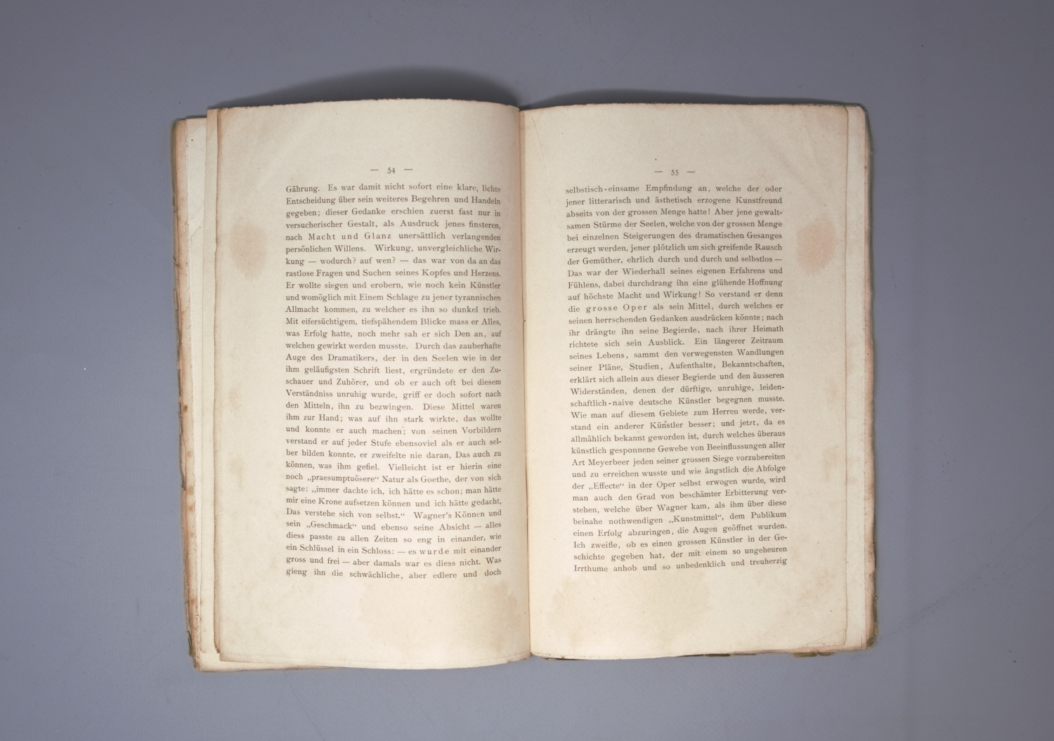 WNB 367 – Erste Ausgabe der letzten von Nietzsches vier kulturkritischen Streitschriften. Sein Verleger Schmeitzner ließ 1.500 Exemplare drucken, davon 800 - wie hier - mit dem irreführenden Zusatz "Zweite Auflage", und erhoffte sich angesichts der ersten Bayreuther Festspiele einen großen Verkaufserfolg, die Absatzzahlen wurden aber recht bald nach unten korrigiert. Sechs sogenannte Festexemplare wurden auf feinstes Papier gedruckt, drei für Nietzsche, eines für Peter Gast und je eins für Richard und Cosima Wagner. – Etwas braun- oder stockfleckig sowie mit mehreren Anstreichungen in Bleistift, die entsprechenden Seiten auch mit geknickter Ecke als Lesezeichen. Innenspiegel mit großem Jugendstil-Exlibris des Philologen und Wasserzeichenforschers Karl Theodor Weiß (1872-1945).