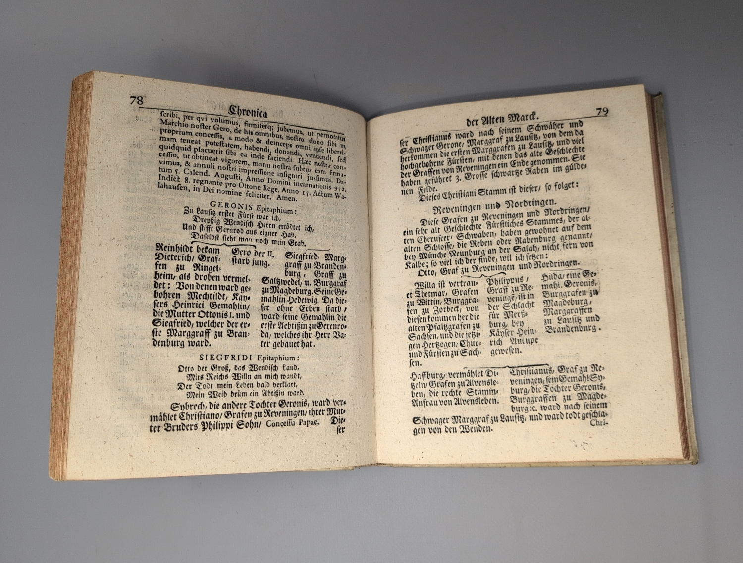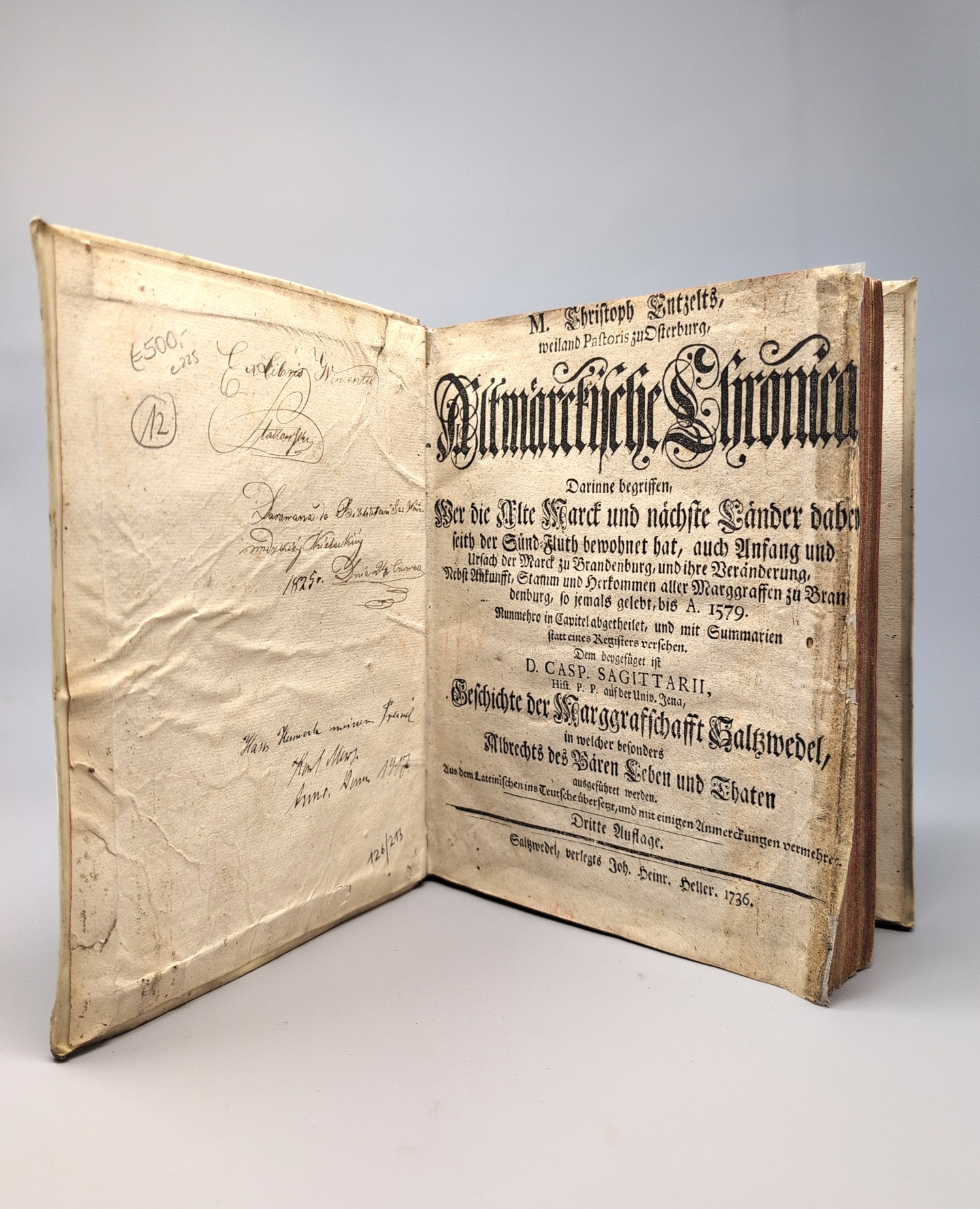 Entzelt, Christoph. Altmärckische Chronica, darinne begriffen, wer die Alte Marck und nächste Länder dabey seith der Sünd-Fluth bewohnet hat, auch Anfang und Ursach der Marck zu Brandenburg, und ihre Veränderung, nebst Ankunfft, Stamm und Herkommen aller Marggraffen zu Brandenburg, so jemals gelebt, bis A. 1579. Aus dem Lateinischen ins Teutsche übersetzt, und mit einigen Anmerckungen vermehrete dritte Auflage. 8 Bl., 196 S. 20 x 16 cm. Pergament d. Z. (etwas fleckig und berieben) mit goldgeprägtem RTitel. Salzwedel, Johann Heinrich Heller, 1736.