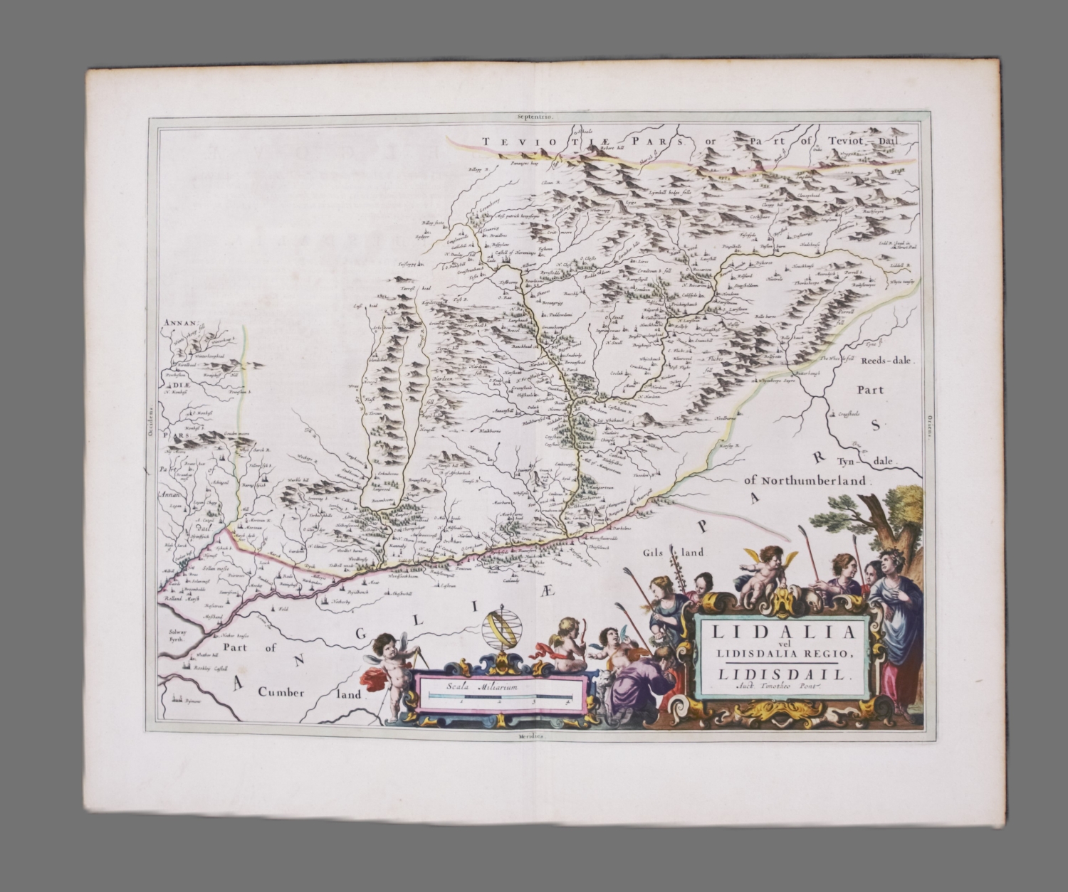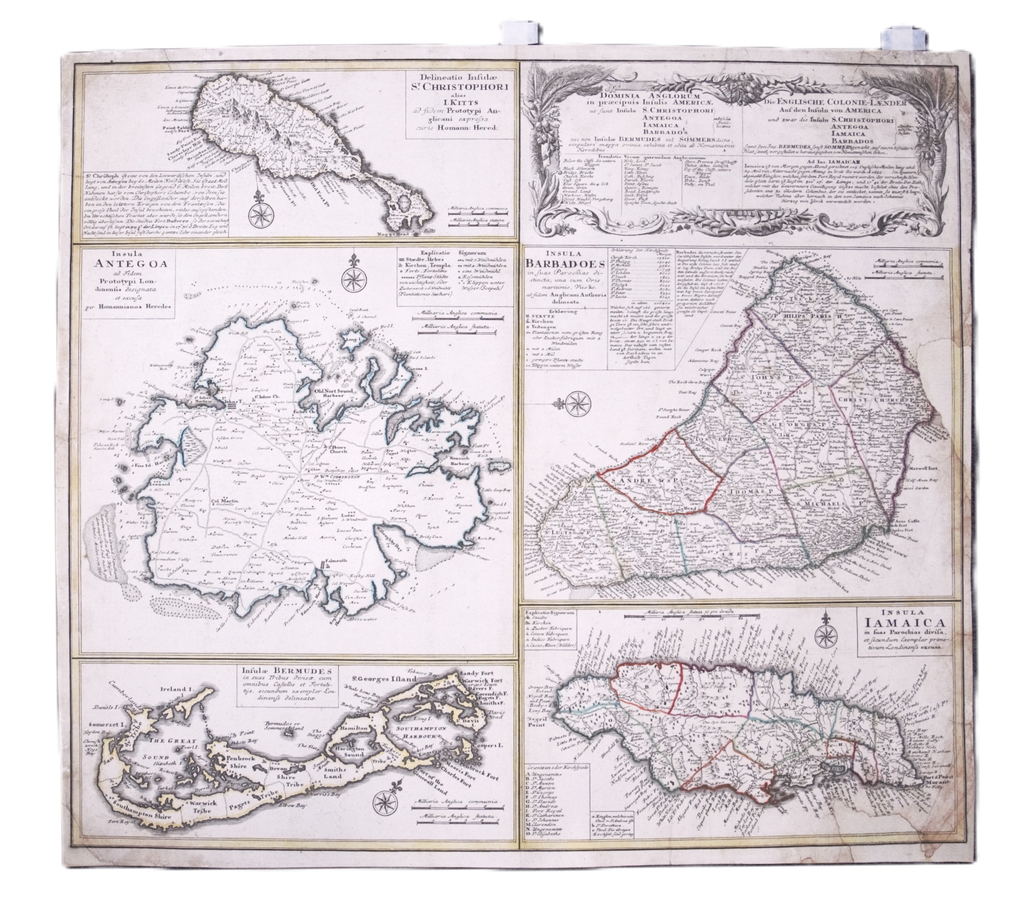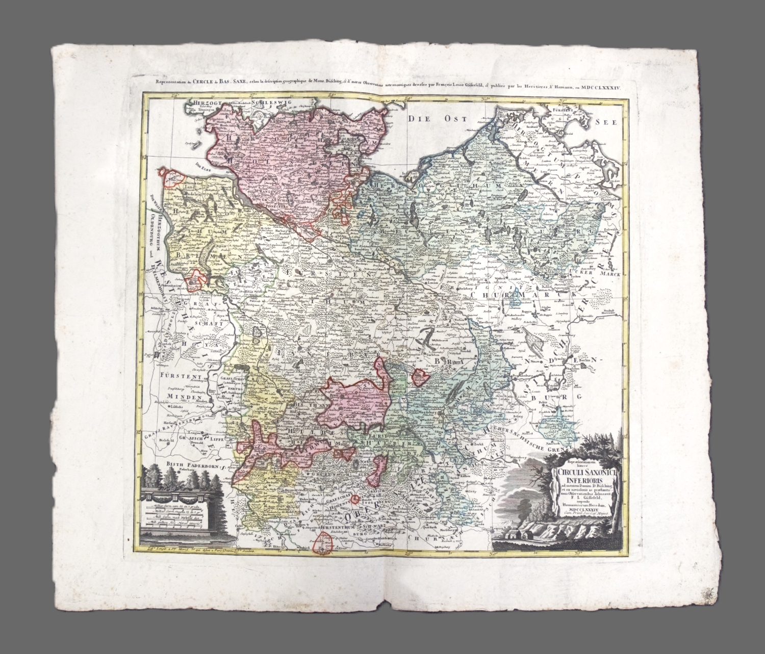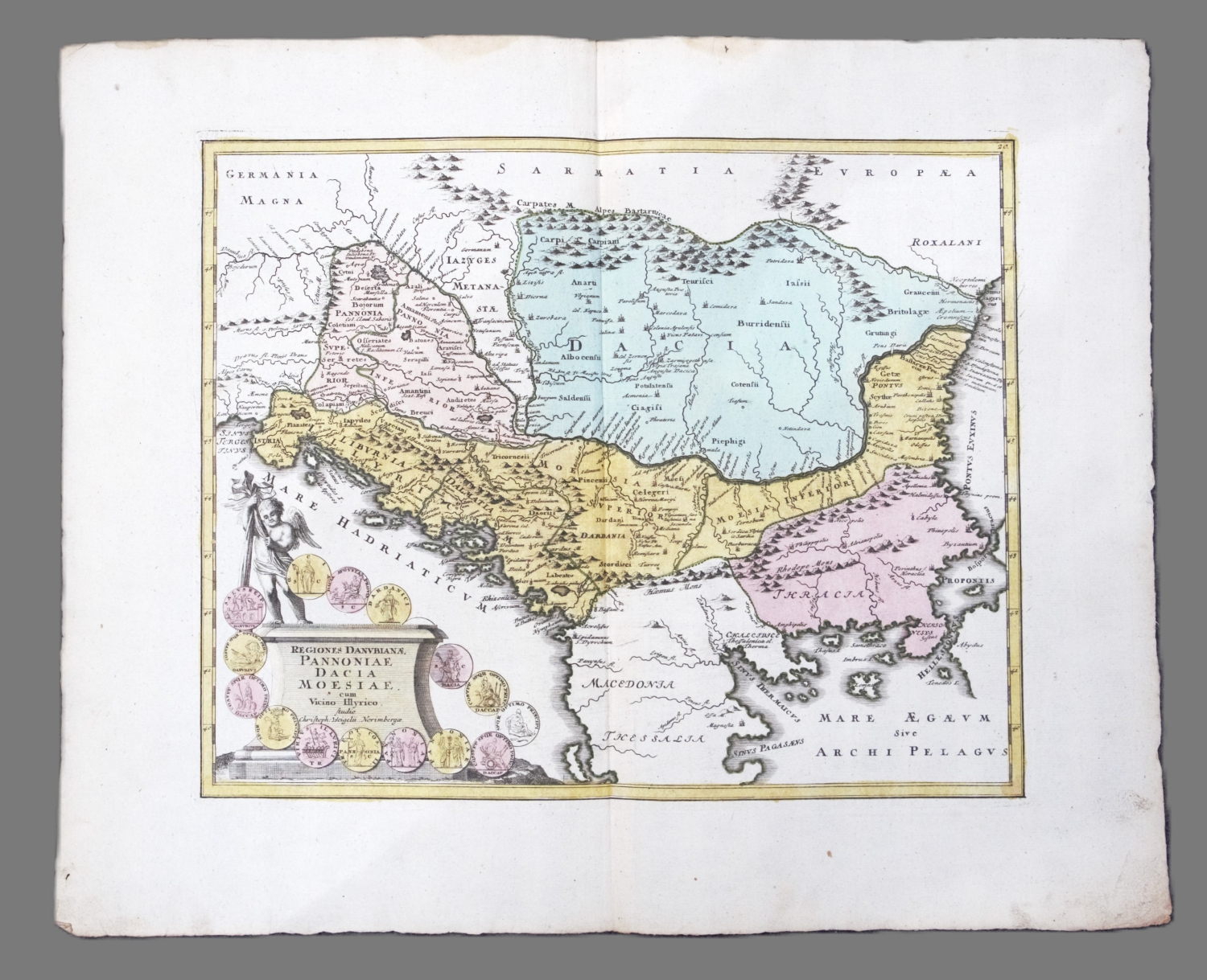 Die Karte zeigt das Gebiet um Münster. Mit zwei großen dekorativen und teils figürlichen Kartuschen. – Knapp beschnitten, mit mehreren Faltfalzen und minimal fleckig. – Dabei: I. Derselbe. Repraesentationem hanc ce circuli Saxonici inferioris. Grenz- und flächenkolorierte Kupferstichkarte. 51 x 54 cm (Plattenrand) bzw. 59 x 68,5 cm (Blattgröße). Ebenda 1734. - II. Derselbe. Dominia Anglorum in praecipuis Insulis Americae. Grenzkolorierte Kupferstichkarte. 49,5 x 55,5 cm (Plattengröße). Ebenda um 1740. - III. Joan Blaeu. Lidalia vel Lidisdalia Regio, Lidisdail. Grenzkolorierte Kupferstichkarte. 41,5 x 52, 5 cm (Plattenrand) bzw. 50 x 61 cm (Blattgröße). Um 1665. - IV. Matthäus Seutter. Saxoniae inferioris Circulus. Grenz- und flächenkolorierte Kupferstichkarte. 50 x 58 cm (Plattenrand) bzw. 55 x 61,5 cm (Blattgröße). Augsburg um 1730. - V. Christoph Weigel. Regiones Danubiane Pannoniae dacia moesiae. Grenz- und flächenkolorierte Kupferstichkarte. 32 x 39,5 cm (Plattenrand) bzw. 42 x 51,5 cm (Blattgröße).