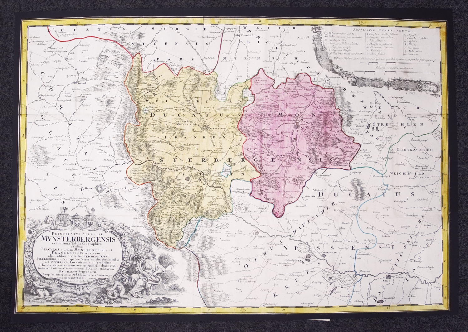 Homann, Johann Baptist. Principatus Munsterbergensis exactissima Tabula Geographica. Grenz- und flächenkolorierte Kupferstichkarte auf Leinen aufgezogen nach Matth. Schubarth und Wieland. 56 x 82 cm (Blattgröße). Nürnberg, Erben Homann, 1736.