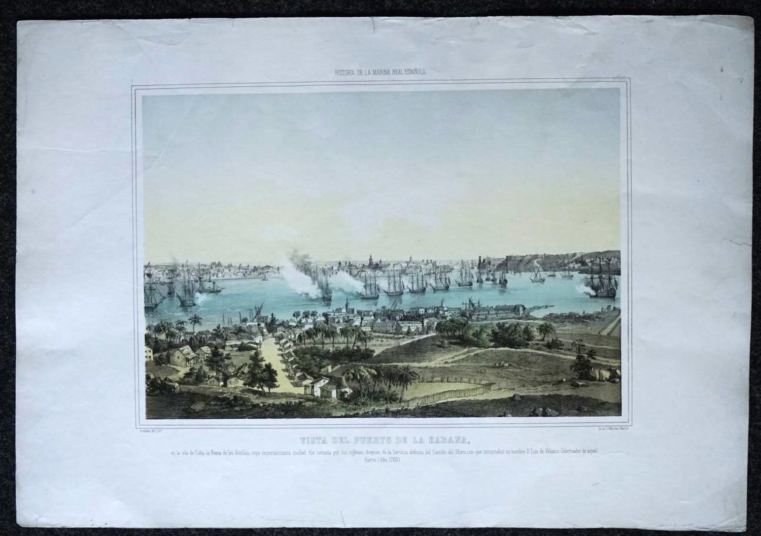 Die Ansicht von Vicente Urrabieta (1813-1879) zeigt den Hafen von Havana mit zahlreichen Schiffsstaffagen. – Etwas braunfleckig, mit hinterlegten kleinen Einrissen und minimal knickspurig. Dekorativ. Selten im Handel.