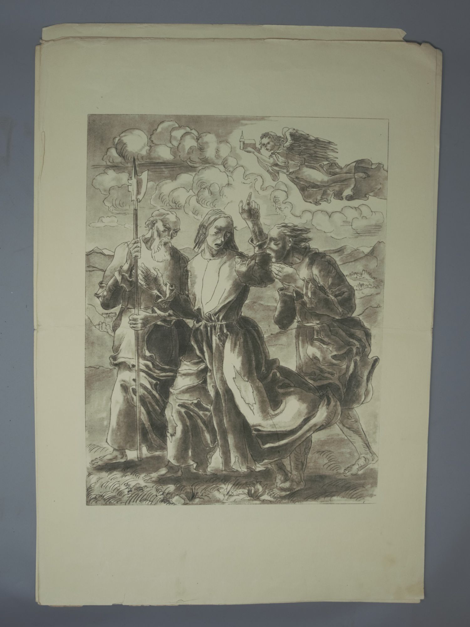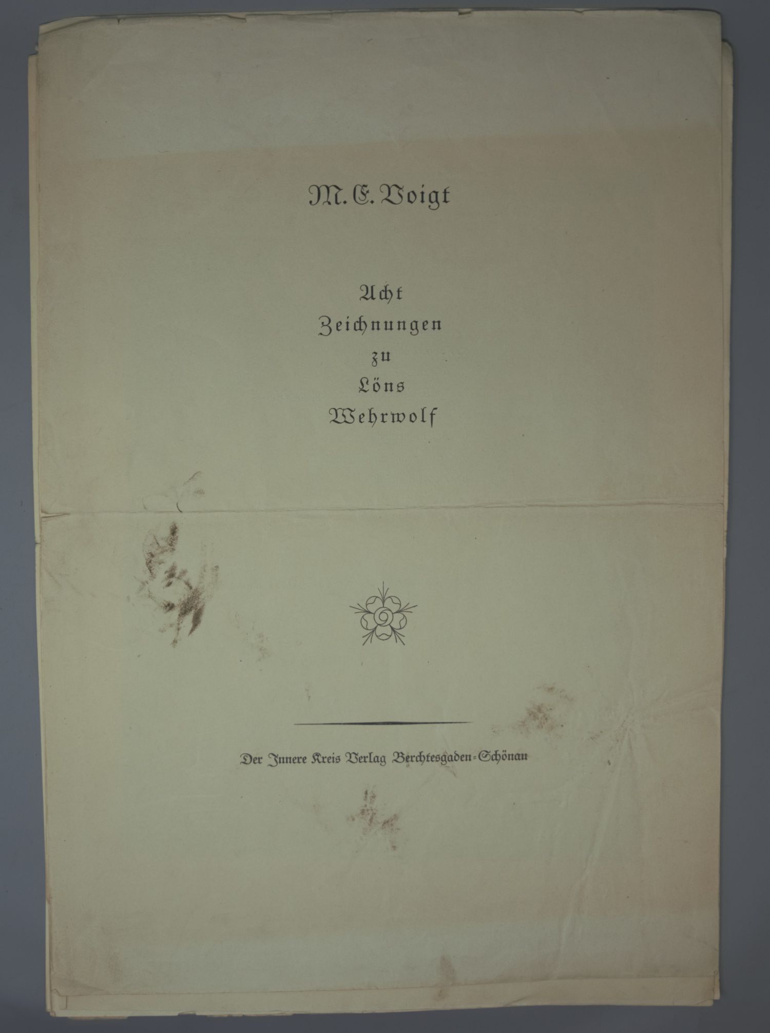 Voigt, M(arie) E(lisabeth). Acht Zeichnungen zu Löns Wehrwolf. 1 Bl. Mit 8 Tafeln. 48,5 x 33,5 cm. Lose Blatt ohne Einband. Berchtesgaden-Schönau, Der Innere Kreis, (1924).