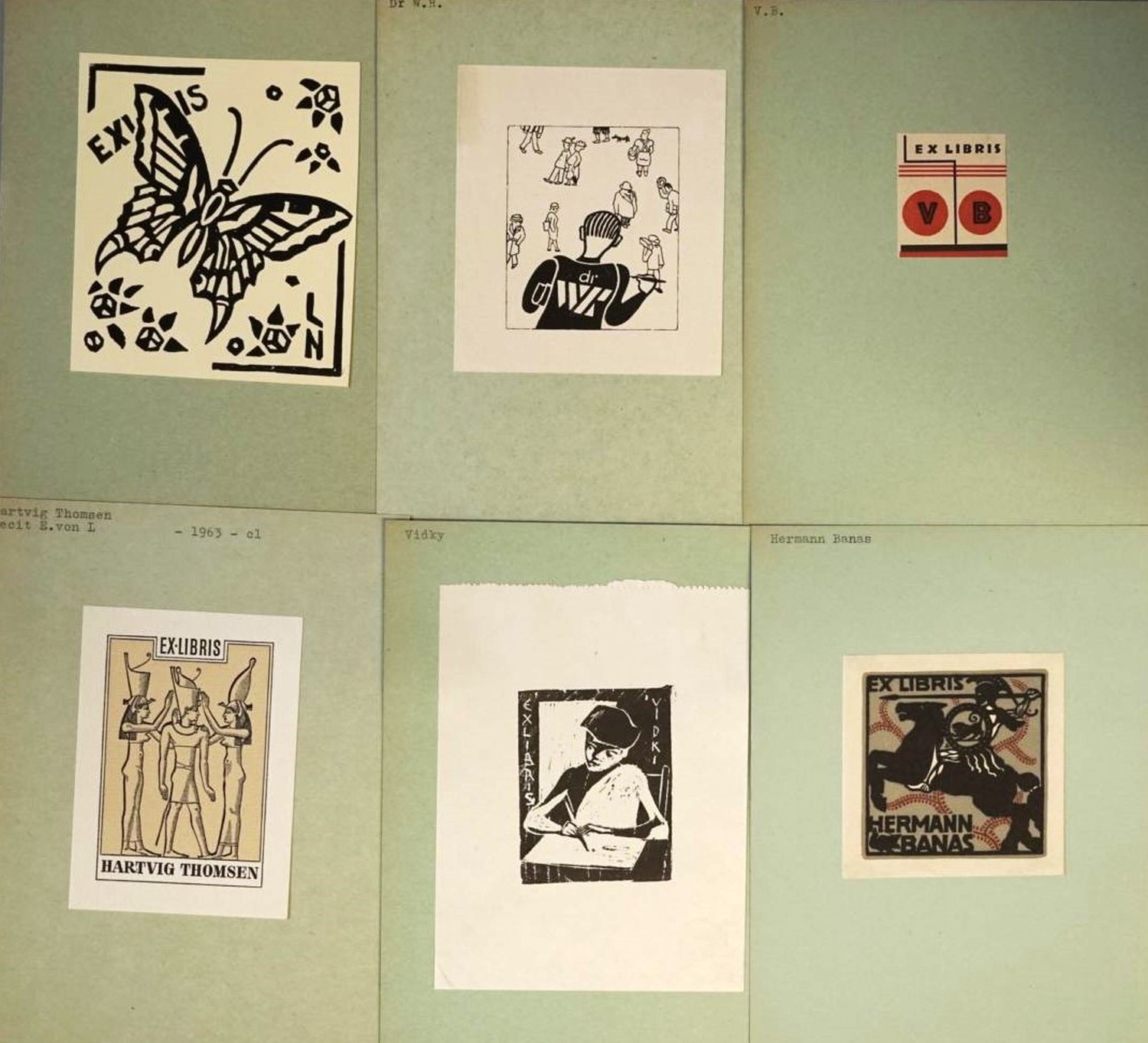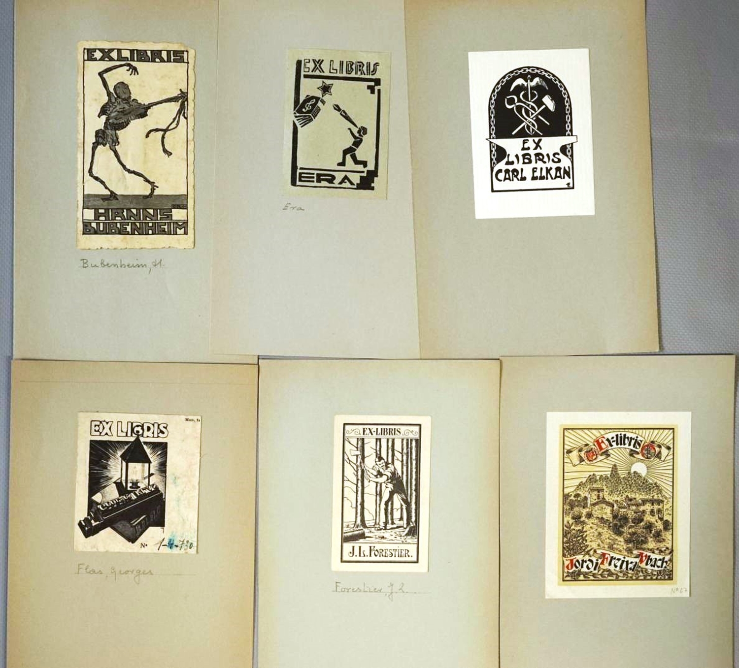 Zahlreiche Exlibris aus dem späten 19 bis in das frühe 20. Jahrhundert und in Original-Graphik, teils im Bauhausstil aus Deutschland und der Tschechoslovakei. Unter den Motiven Landschaften, Bücher, Blumen, Tiere, Erotika, Asiatika, Wappen, etc. – Vereinzelt mit Gebrauchsspuren. Wohlerhalten. Beiliegend ein Schuber mit ca. 150 Fotokopien verschiedener Exlibris.
