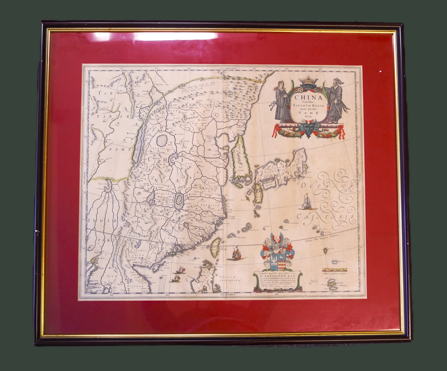 Blaeu, Johannes. China veteribus sinaru regio nunc incolis tame dicta. Kolorierter Kupferkarte. 41 x 50 cm (Plattenrand). Unter Glas mit Passepartout in goldgeprägter Holzprofilleiste. Amsterdam um 1640.