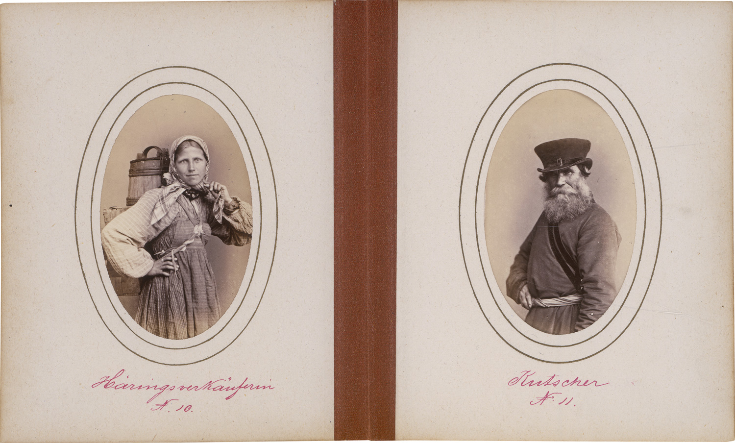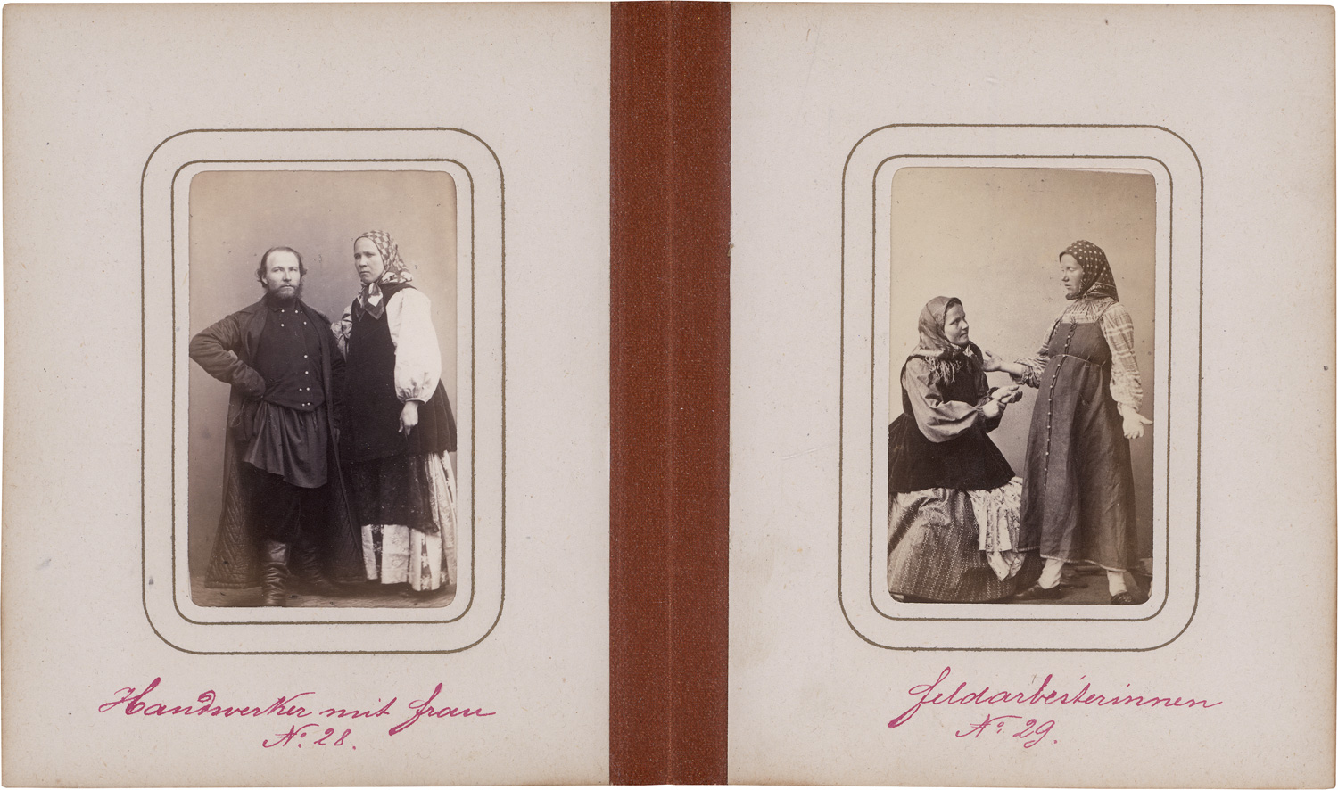 The Scottish-Russian artist and photographer William Carrick was born in Edinburgh and raised in Kronstadt. In 1844, his family moved to St. Petersburg, where he enrolled at the Imperial Academy of Arts to study architecture. During a brief return to Edinburgh in 1857 to deepen his knowledge of photography, Carrick met the photographic technician John MacGregor. The two returned to Russia together and established a studio in St. Petersburg, with MacGregor serving as Carrick’s assistant. Carrick quickly emerged as a pioneering photographer of Russian ethnographic subjects, documenting rural life with notable humanity and sensitivity. In 1871, the pair undertook a month-long journey through the Simbirsk province, producing a remarkable series of photographs depicting Russian and Mordovian peasants. Popular with contemporary tourists, these images are now exceptionally rare. The album presented here opens with portraits of Tsar Alexander II and Empress Maria Alexandrovna. – Edges of album spine slightly rubbed, photos with slight fading in edges, otherwise in good condition and several with strong contrasts.