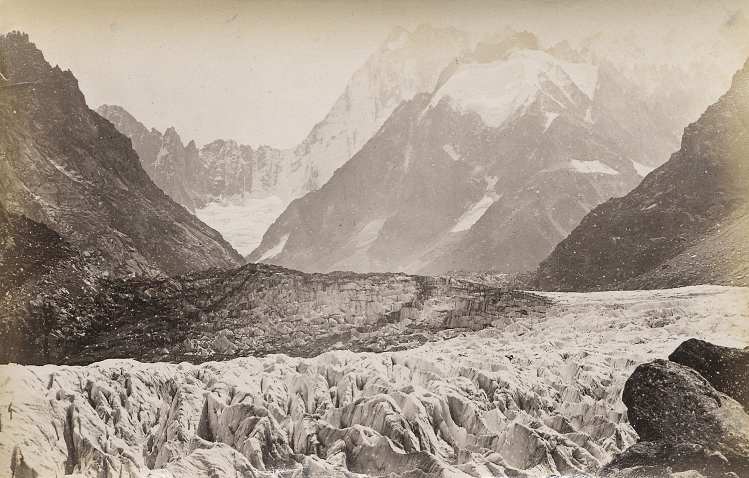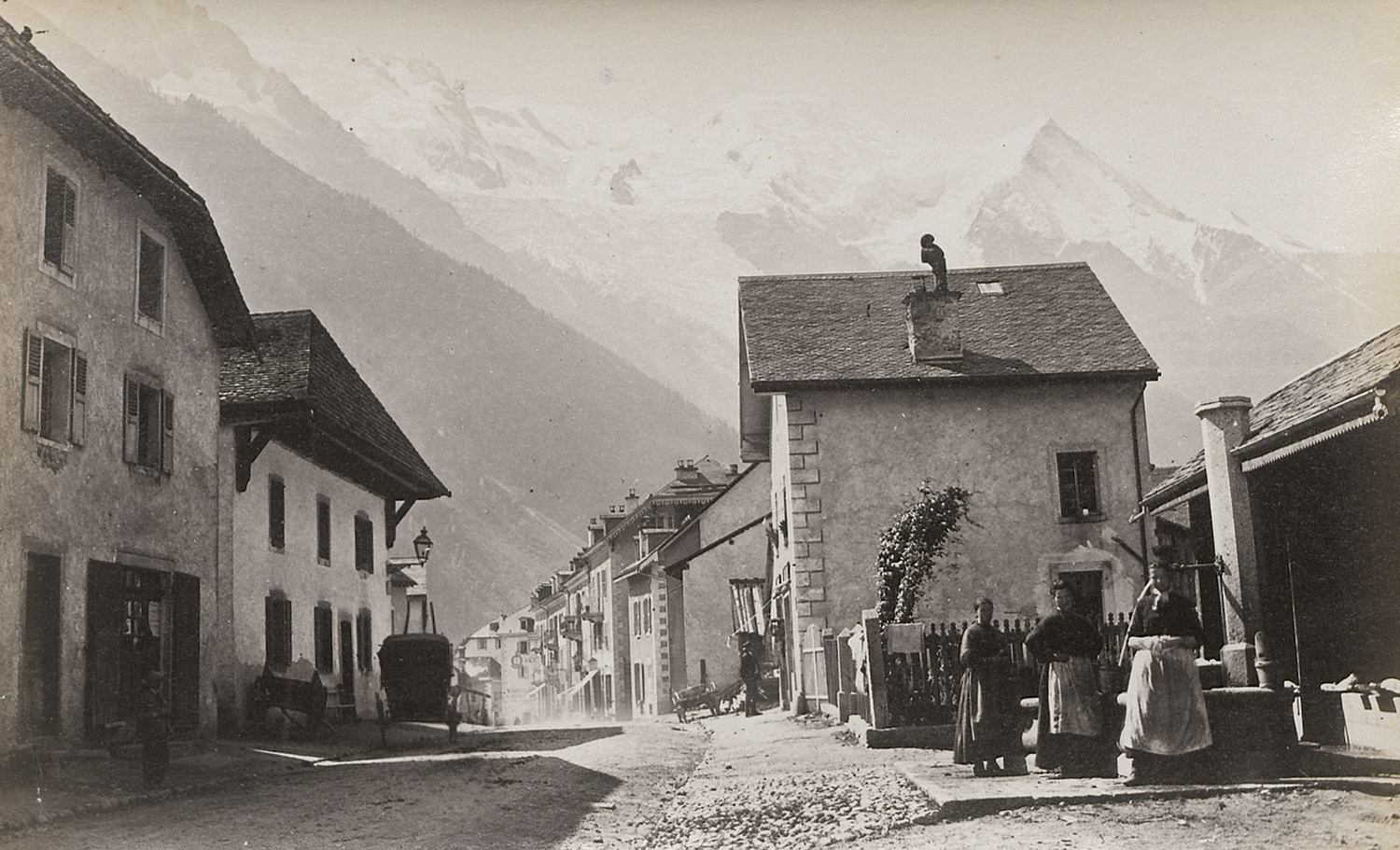The album includes a wide-ranging selection of city and landscape views from Switzerland and surrounding regions, among them Zurich, Lucerne, Brunnen, Axenstein, the Axenstrasse, the Gotthard Railway, Andermatt, the Rhône and Grindelwald Glaciers, Wengernalp, Mürren, Bad Leuk and the Gemmi Pass, Monte Rosa, Breithorn, Chamonix with Mont Blanc, the Mer de Glace (several views), Zermatt with the Matterhorn, Vernayaz, Montreux, Nyon, Geneva, Fribourg, Bern, Basel, and Strasbourg Cathedral. The album was most likely compiled by the Berlin banker Paul Bercht (1847-1899), whose name is stamped on the cover. – Edges of album worn, canvas rippled, pages buckled and some with light foxing, some prints with light fading in edges, first prints with slight insect damage, otherwise most with strong tones and in good to very good condition.