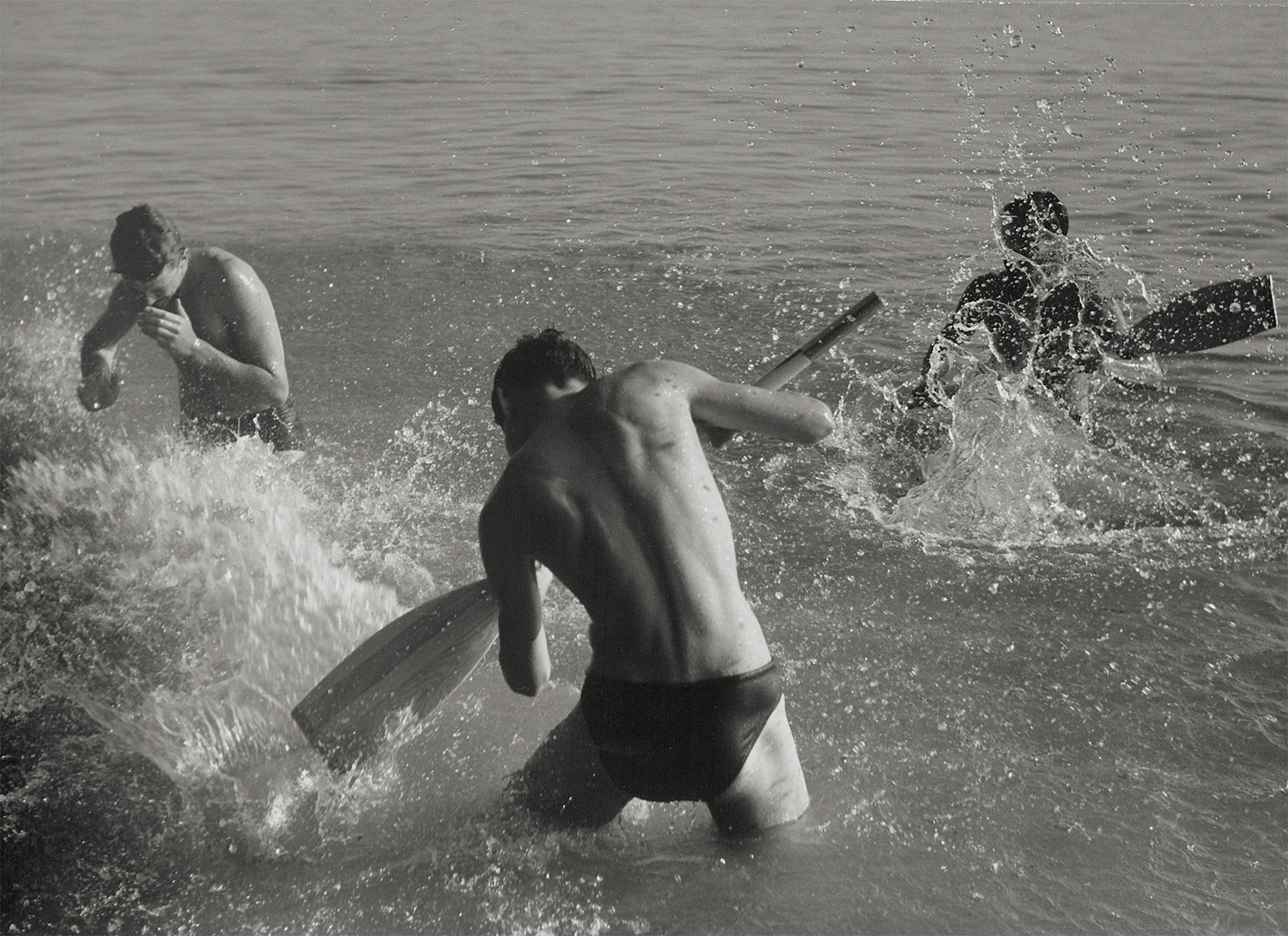 Young men in water. 1949. Vintage ferrotyped gelatin silver print on doubleweight Agfa-Brovira paper. 21,2 x 28,8 cm. Annotated in pencil on the verso.
