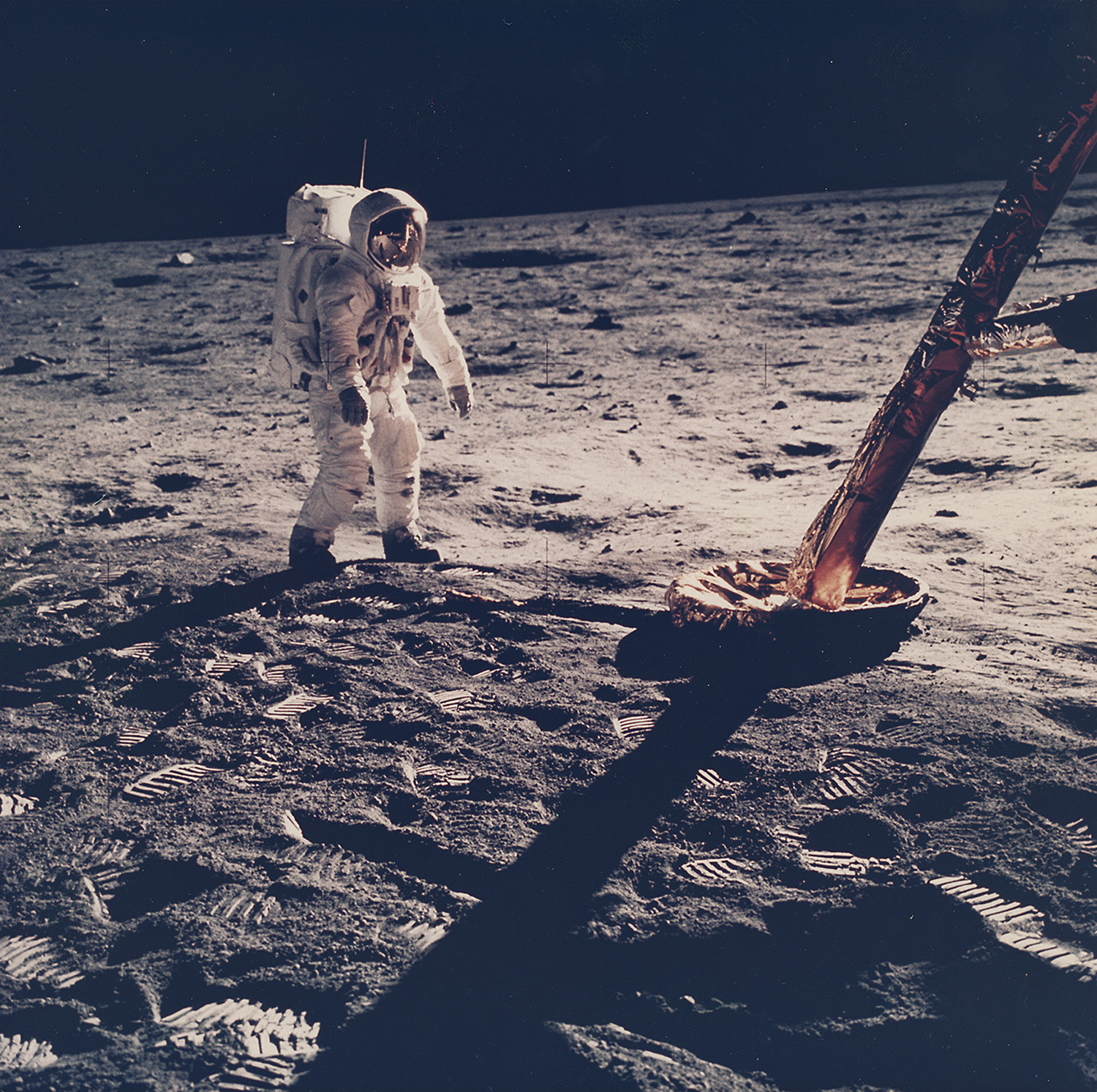 "Our LM was sitting there with its black, silver, and bright yellow-orange thermal coating shining brightly in the otherwise colorless landscape. I had seen Neil in his suit thousands of times before, but on the Moon the unnatural whiteness of it seemed unusually brilliant" - Buzz Aldrin. – A few small spots in sky area, otherwise in very good condition.
