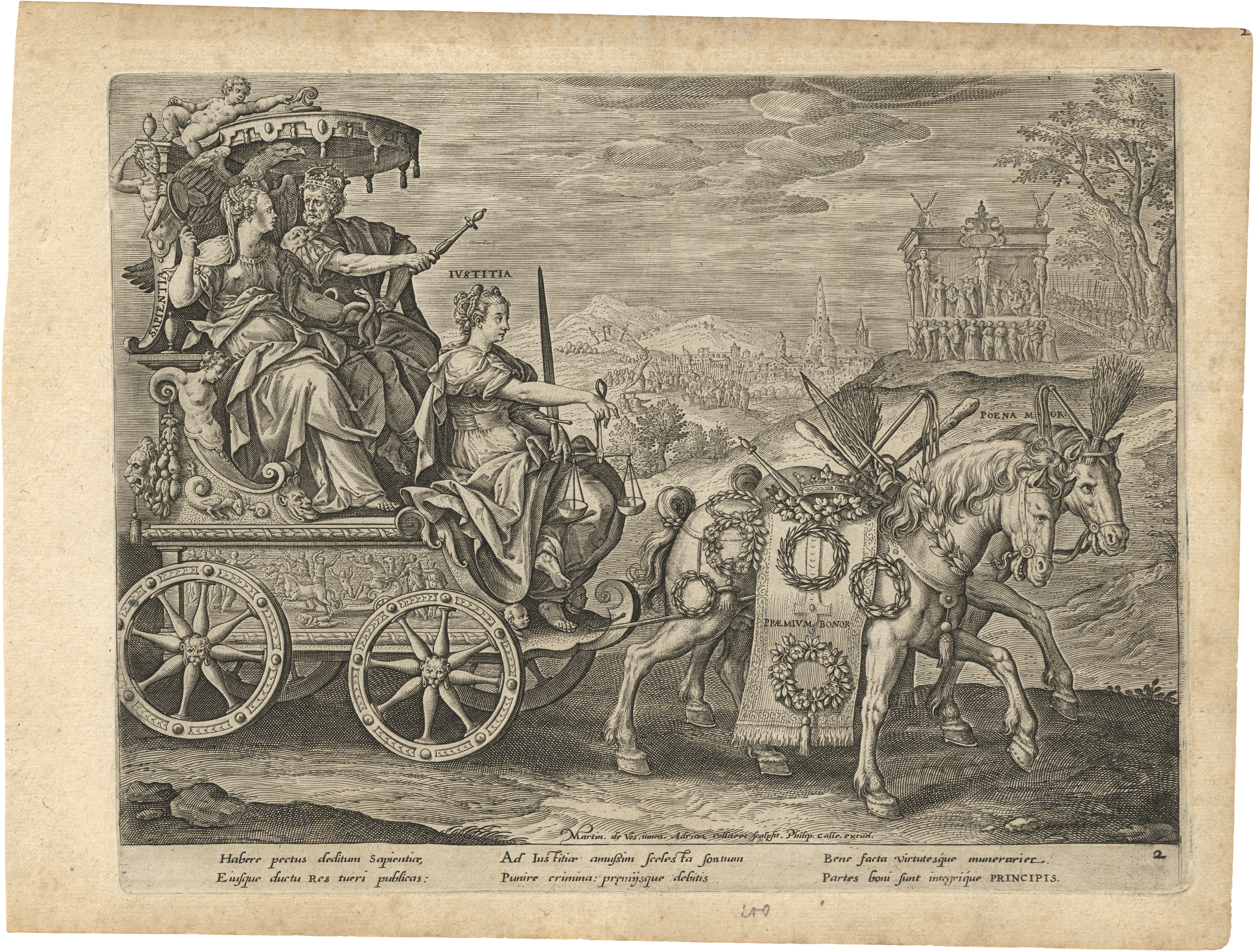 Trium Humani Generis Ordinum Sive Statuum - Die göttliche Bestimmung der drei Stände. 4 Kupferstiche nach Maarten de Vos. Je ca. 22,9 x 29,7 cm. Um 1585-1586. Hollstein 461-464, Hollstein (Vos) 1257-1260, Diels/Leesberg (New Hollstein) 1070 I (von II), 1071 II (von III), 1072-1073, je I (von II). Wz. Wappen (ähnlich Heawood 531-532: Den Haag 1599).