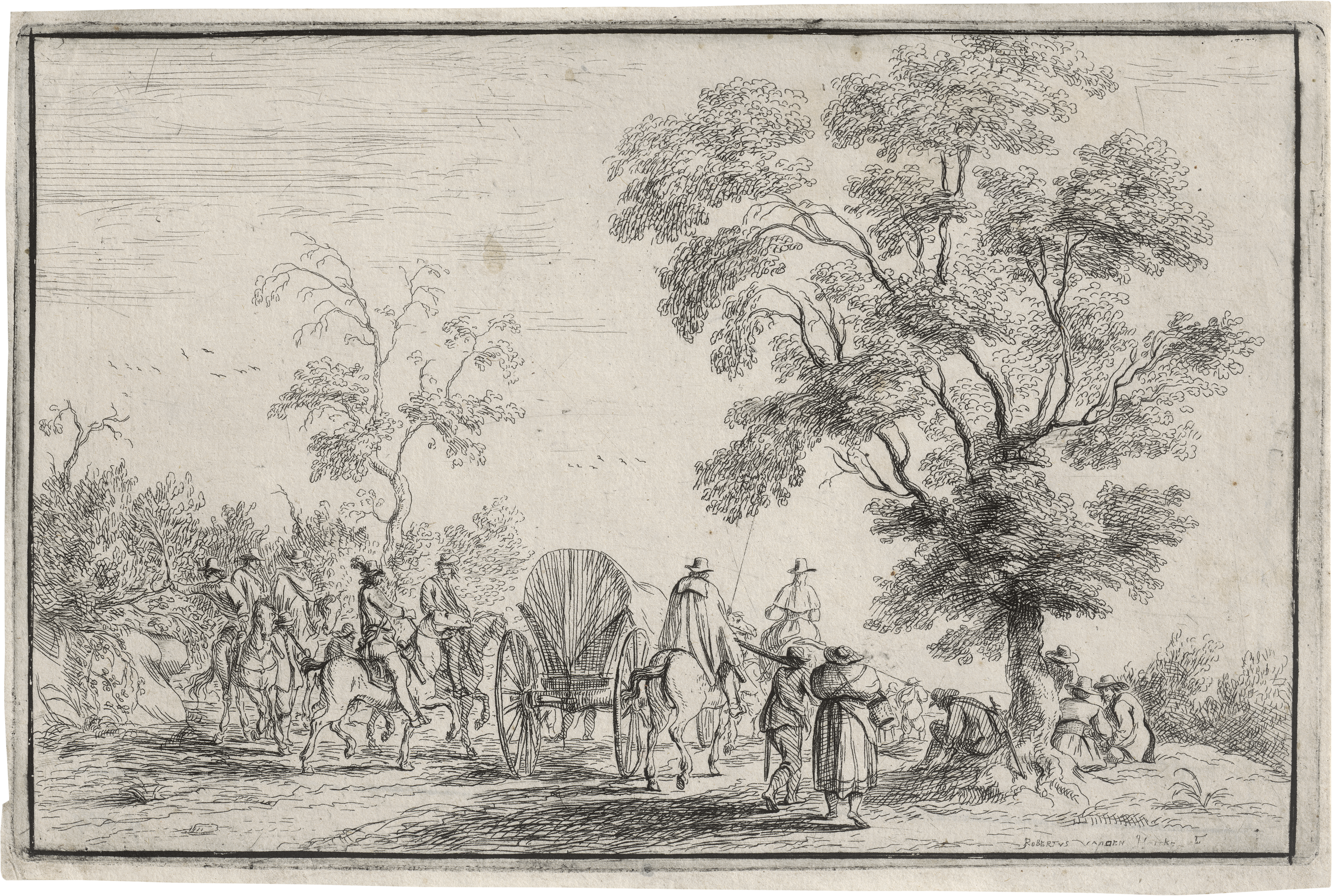 Der Wagen mit der Eskorte. Radierung. 13,8 x 21,5 cm. Hollstein 15 III. Wz. Siebenzackige Schellenkappe.