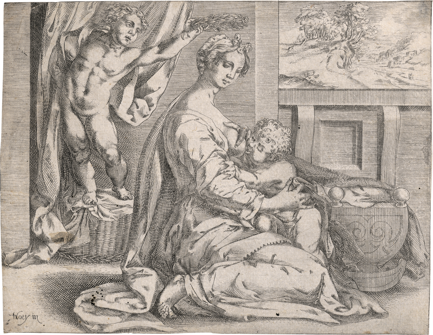 Die stillende Jungfrau mit einem Lorbeerzweig gekrönt. Radierung. 14,1 x 18,2 cm. Nicht in Wurzbach, nicht in Hollstein. Wz. Kleines Wäppchen über Schrift.