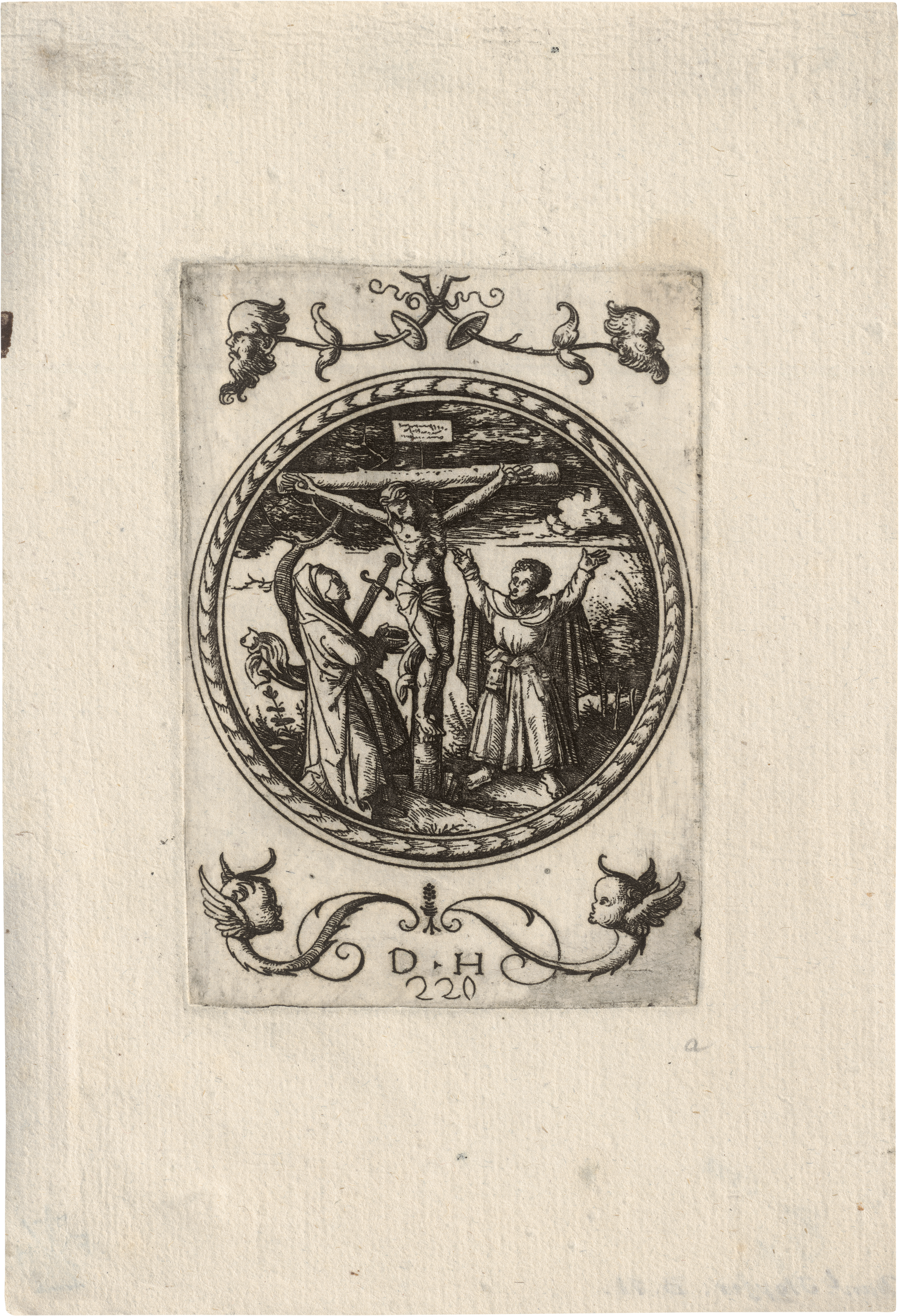 Christus am Kreuz mit Maria und Johannes, in einem Tondo. Eisenradierung. 9,5 x 6,6 cm. B. 11, Hollstein 16 II (von III), Metzger 21 III (von VI). Wz. Fragment.