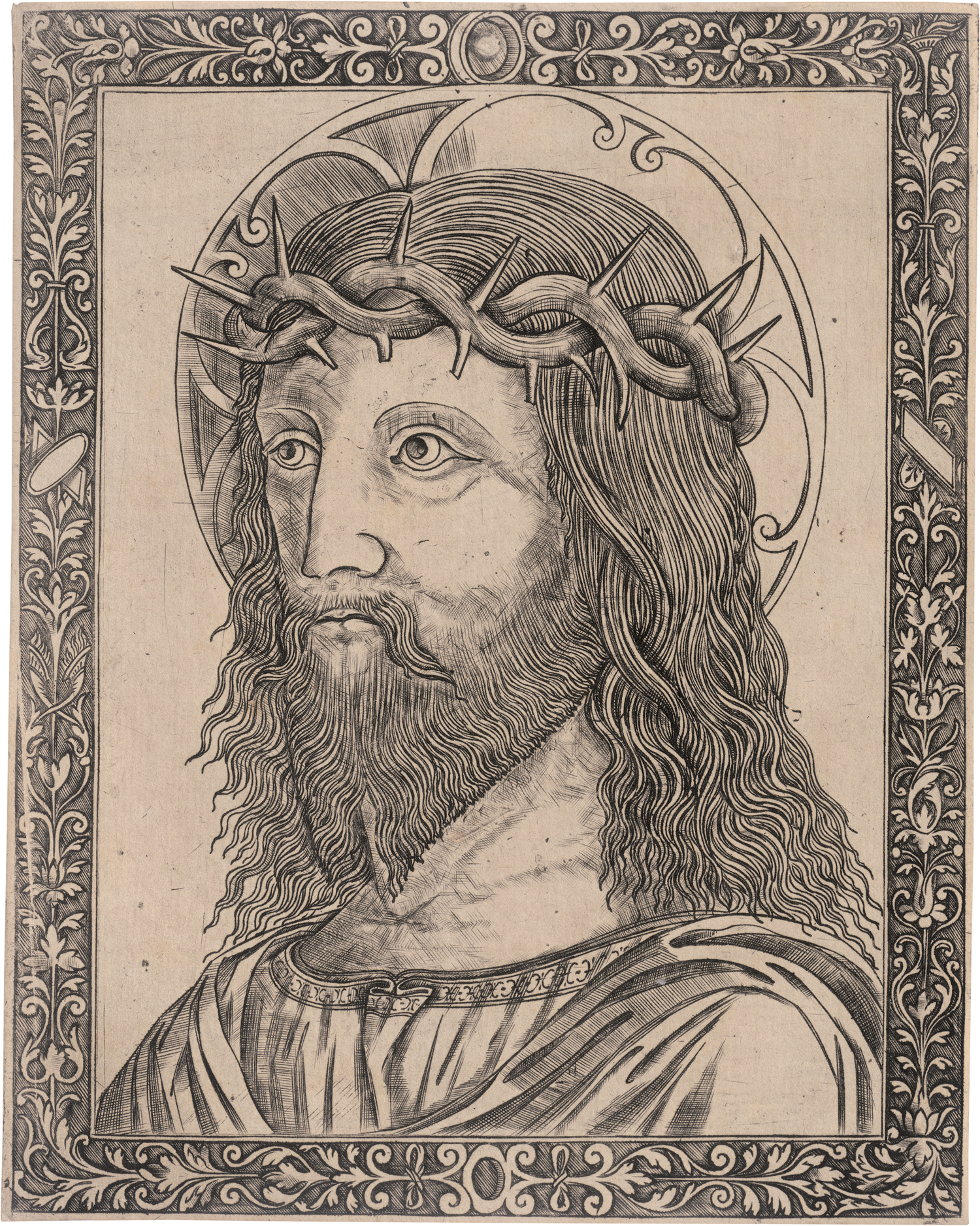 um 1490-1510. Christuskopf mit Dornenkrone. Kupferstich. 18 x 14,3 cm. Hind V, S. 78, 6, TIB 2411.023, S. 86.