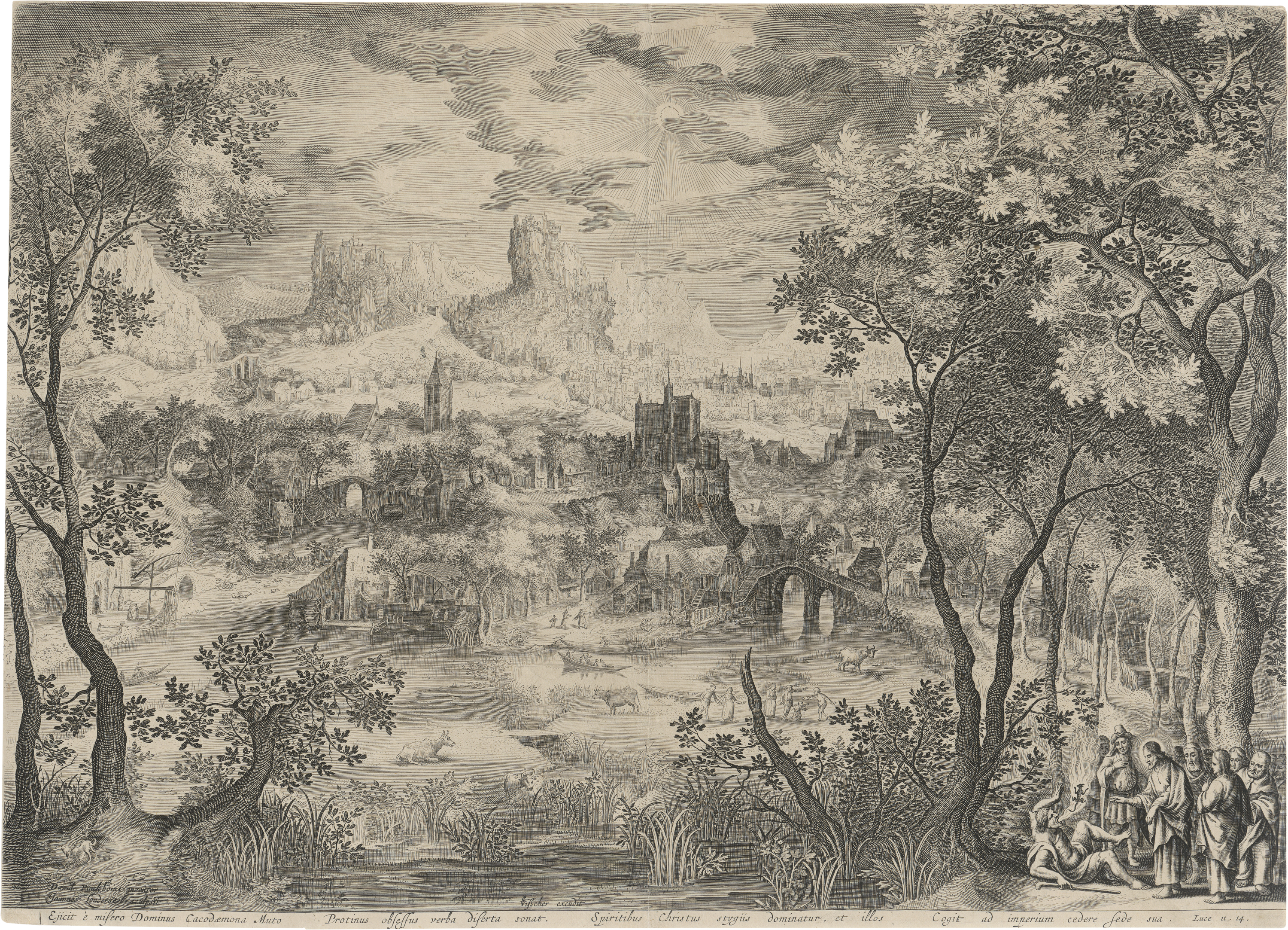 Landschaft mit Christus, der einem Kranken den Dämon austreibt. Kupferstich nach David Vinckboons. 34,7 x 48,2 cm. Hollstein 20.