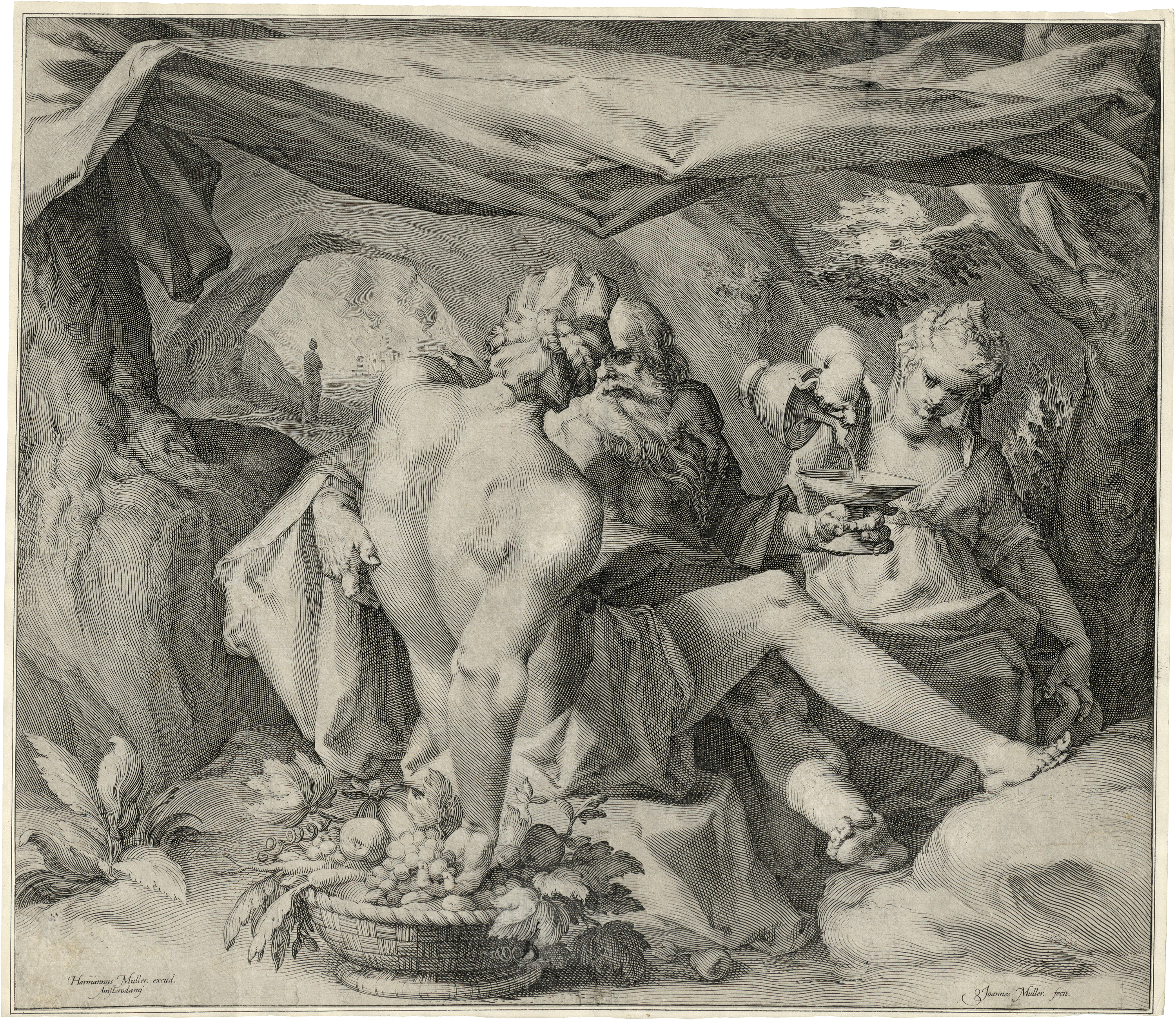 Loth und seine Töchter. Kupferstich nach Bartholomäus Spranger. 40 x 45,9 cm. B. 64, Hollstein 10, Filedt Kok (New Hollstein) 64 wohl II (von IV).