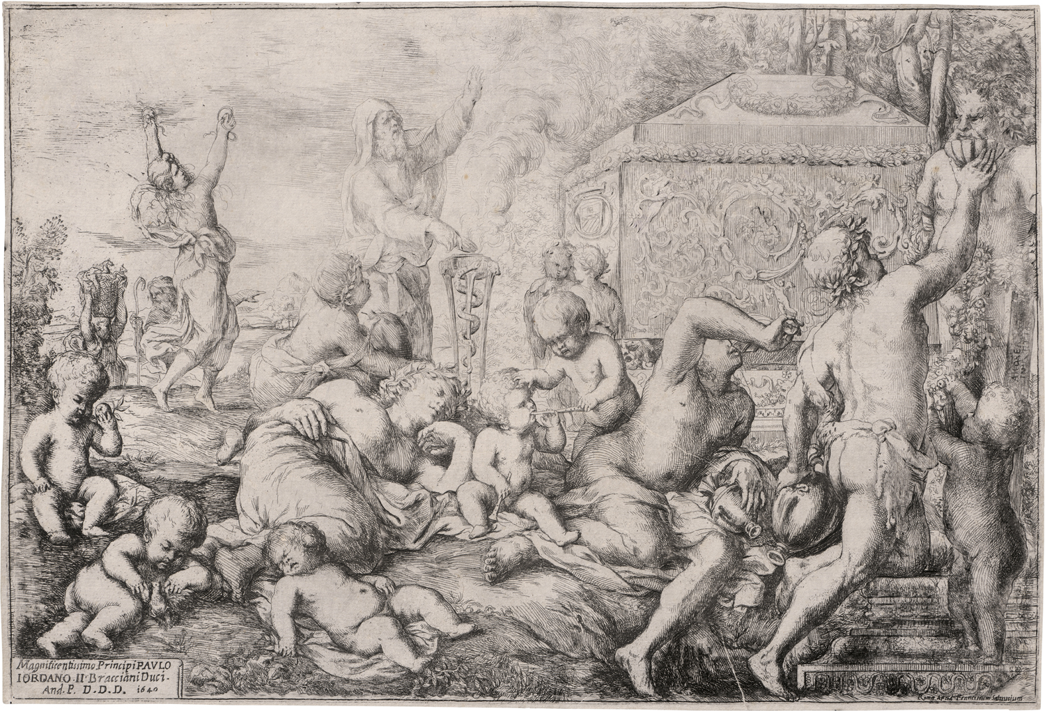 Das Blatt ist Paolo Giordano Orsini zugeeignet. Ausgezeichneter, gegensatzreicher Frühdruck vor Änderung der Jahreszahl von 1640 zu 1649 sowie noch mit der Adresse von Francesco Salucio rechts unten. Überwiegend mit feinem Rändchen um die teils gratig zeichnende Facette, teils an diese geschnitten. Unten rechts der Mitte kurze Quetschfalte vom Druck, verso leichte geglättete Knickspuren und kleine Bleistiftannotationen, nur schwach fleckig, kleine Montierungsreste verso, sonst sehr schön erhalten. Aus der Sammlungen Paul Lüttke (nicht bei Lugt) und Dr. Volkmar Reichmann (Lugt 6224).