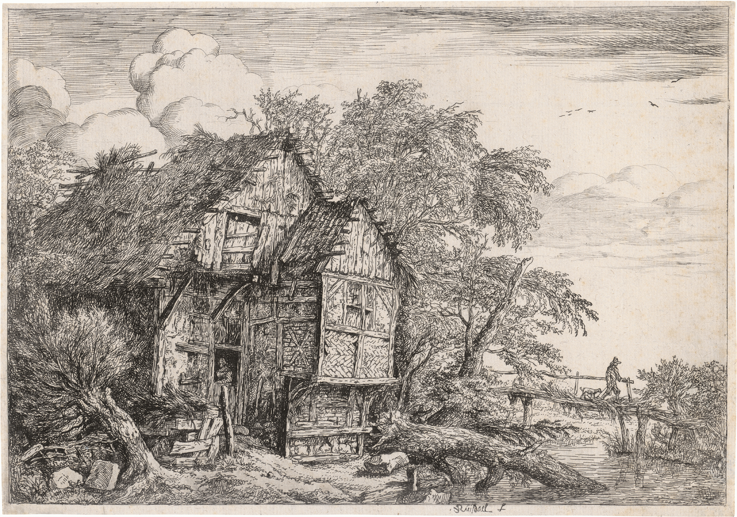 Die kleine Brücke. Radierung. 19,3 x 27,7 cm. Um 1650. B. 1, Hollstein 1 II. Wz. Traube mit Schriftzug.