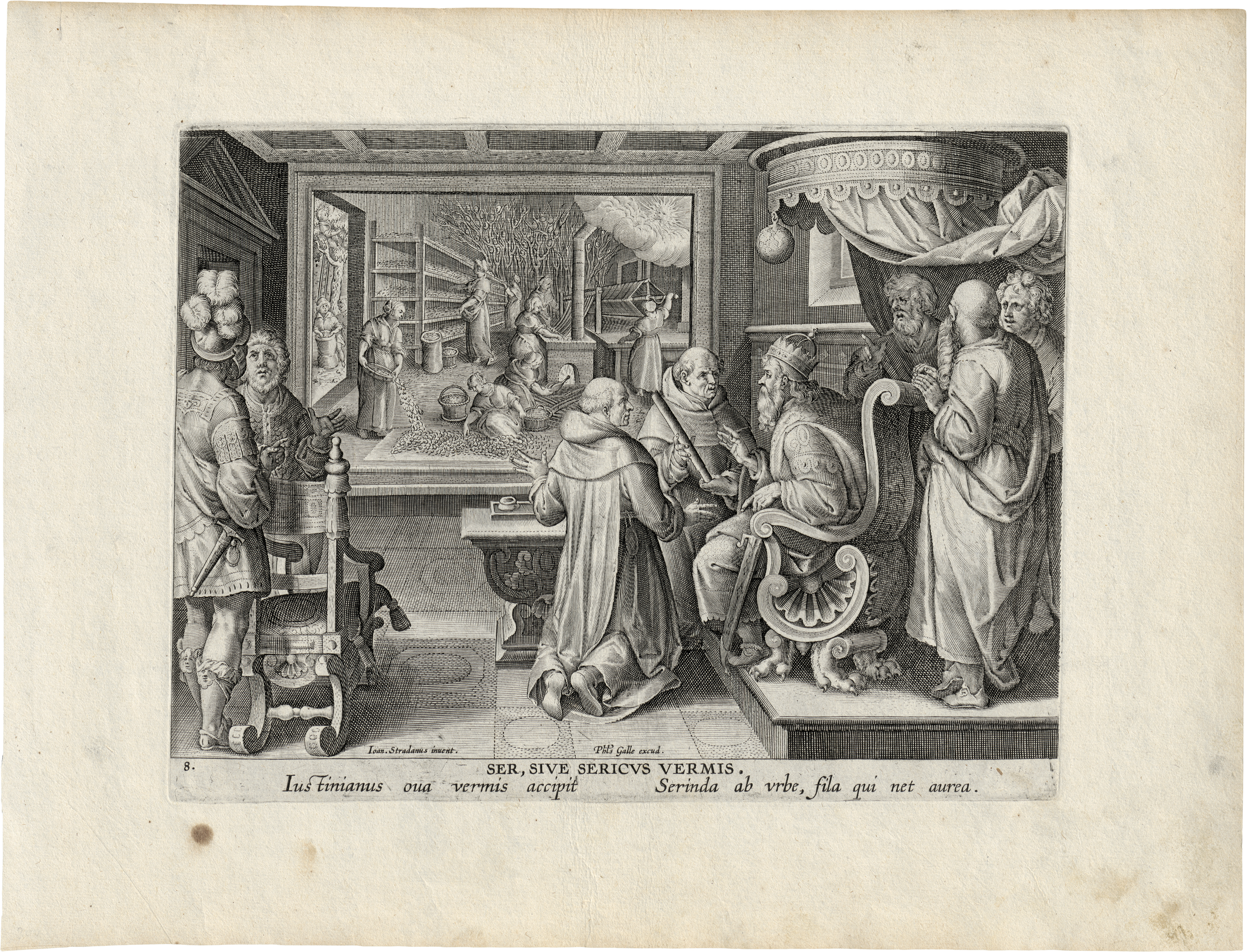 nach. Ser, sive sericus vermis - Die Erfindung der Seidenproduktion. Kupferstich von Theodor Galle. 20,4 x 26,8 cm. Leesberg (New Hollstein, Stradanus) 330 I (von III). Wz. Doppelkopfadler.