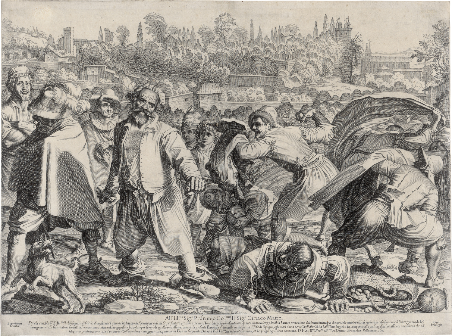 Satirische Darstellung auf die Unruhen der Liga unter Heinrich IV. von Frankreich. Die Komposition wurde von Villamena dem großen Kunstmäzen Ciriaco Mattei (1542-1614) gewidmet. Sie zeigt einen Straßenkampf zwischen dem sogenannten „Bruttobuono“, welche die Spanier unterstützten, und Steine werfenden, pro-französischen Schlägern. Kämpfe zwischen Anhängern der spanischen und französischen Fraktionen waren zu dieser Zeit in Rom weit verbreitet. Hinter den Figuren ist ein Blick auf den Caelius mit der Villa Mattei zu sehen. - Prachtvoller, klarer Druck vor der Adresse von Pierre II. Mariette, 1667, in dessen Sammlung unser Exemplar 1680 Eingang fand. Mit der Plattenkante, teils knapp innerhalb dieser. Minimal fleckig, verso vertikale Mittelfalz, dort mittig kleine Läsuren, sowie oben und unten ausgebesserte, weitere Alters- und Gebrauchsspuren, sonst sehr schönes Exemplar. Selten. Aus der Sammlung Pierre II. Mariette, 1680 (Lugt 1788, ein 1678 datiertes Exemplar des ersten Zustandes befindet sich im British Museum) und Ritter Joseph-Guillaume-Jean Camberlyn (Lugt 514).