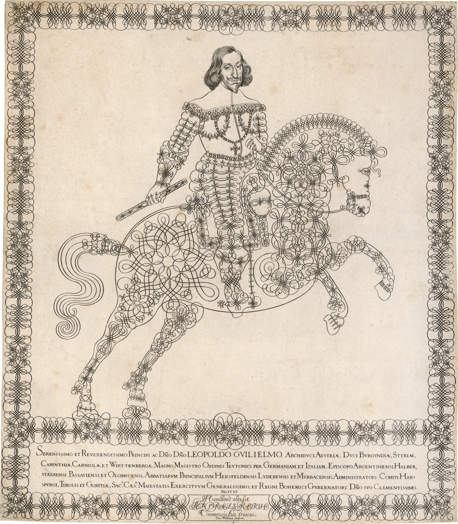 Schreibmeisterblatt mit dem Bildnis Erzherzoges Leopold Wilhelm zu Pferd. Radierung. 47,5 x 41,5 cm. "Elias Wideman sculpsit". Nagler 4, Berliner Ornamentsichkat. 4830.