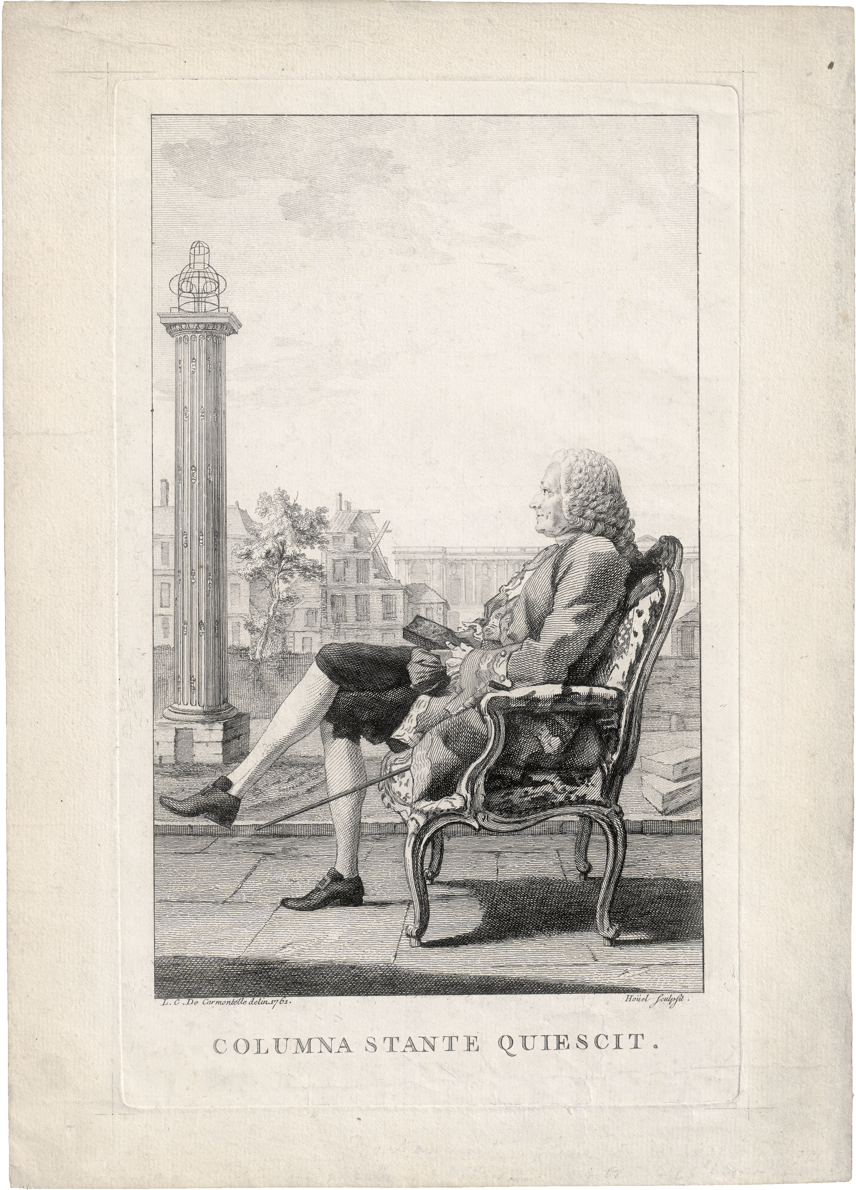 Vorliegendes Portrait des Louis Petit de Bachaumont schuf der Maler, Kupferstecher, Radierer und Schriftsteller Jean-Pierre Louis Laurent Houël (1735-1813) nach einer Zeichnung Carmontelles, die sich heute im Musée Condé in Chantilly befindet (Inv. CAR 390). Louis Petit de Bachaumont war Arzt, Schriftsteller und Salonkritiker. Er verkehrte im Salon der Mme. Doublet und redigierte die dort gesammelten Nouvelles à la main, die per Abonnement verschickt wurden und teils brisante Neuigkeiten des Hoflebens, aus Politik und Kultur verbreiteten. Bachaumont ist dargestellt vor einer fiktiven Kulisse aus einem Teil des Louvre und der Säule für Katharina von Medici im Hôtel de Soissons, für deren Erhaltung sich Bachaumont engagiert hatte und auf die die Bildunterschrift bezogen ist. Ausgezeichneter Druck mit Rand um die prägnant zeichnende Plattenkante. Geringfügige Handhabungsspuren an den Rändern, zwei Knitterfalten oben und unten, verso kleine Montierungsspuren, sonstn in sehr schöner Erhaltung.