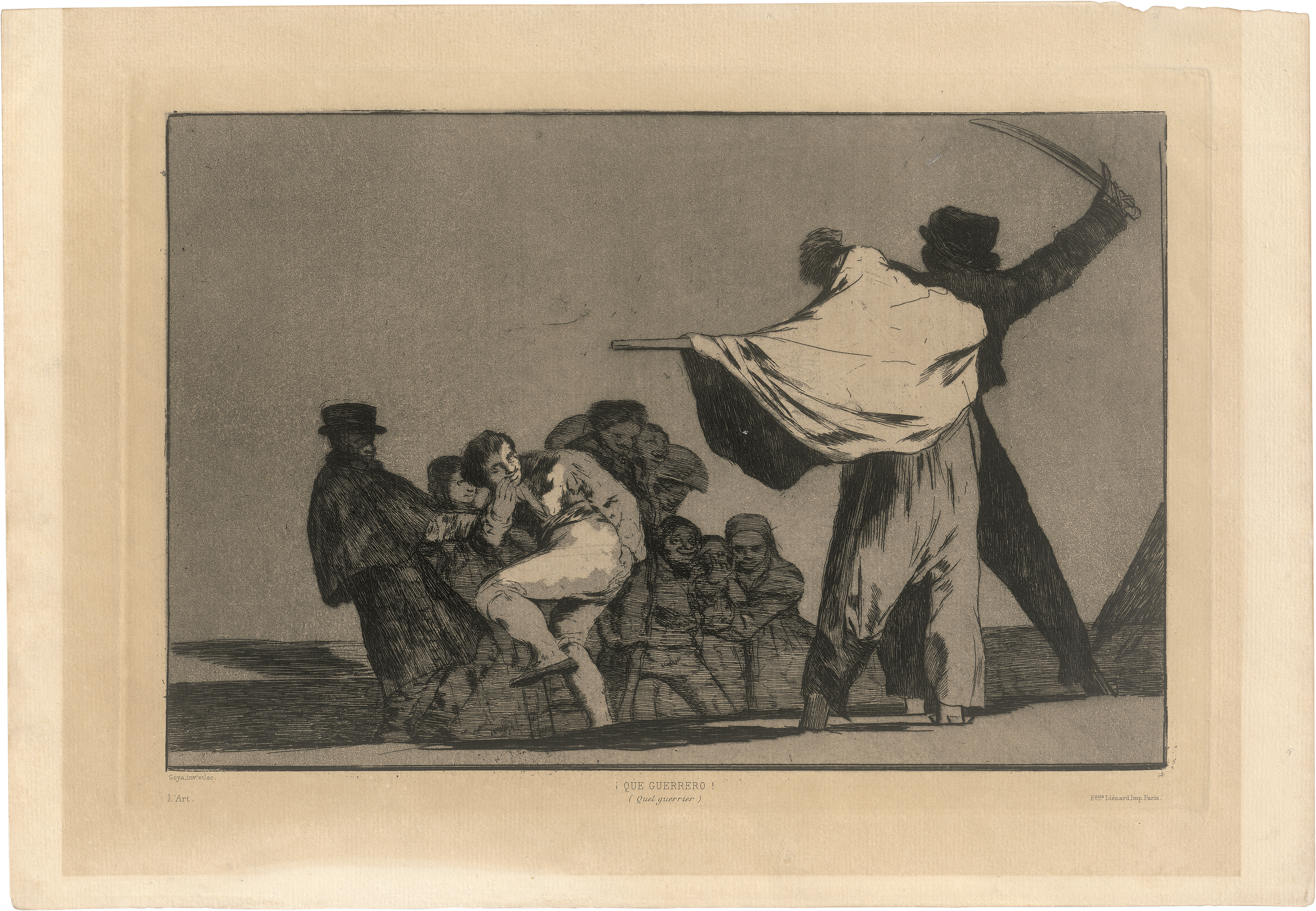 Das erste der zusätzlichen vier Blätter zur Folge. Die damalige Interpretation der bewusst uneindeutig gestalteten Szenerie ging dahin, dass das Volk das Machtgehabe und den Pomp als reines Gehabe der Regierung enttarnen sollte. Vorliegende Darstellung wurde daher mit dem Sprichwort "Dos a uno, meten la paja en el culo" ("Wenn zwei gegen eins, muss man sich eben den Hintern mit Stroh stopfen") verbunden interpretiert. Ganz ausgezeichneter Druck mit dem wohl vollen Rand. Im Passepartoutausschnitt gebräunt und mit leichtem Lichtrand, leichte Gebrauchsspuren im weißen Rand, sonst noch sehr gut erhalten. Beigegeben von Goya "Aveugle Enlevé sur les Cornes d'un Taureau" (Harris 25).