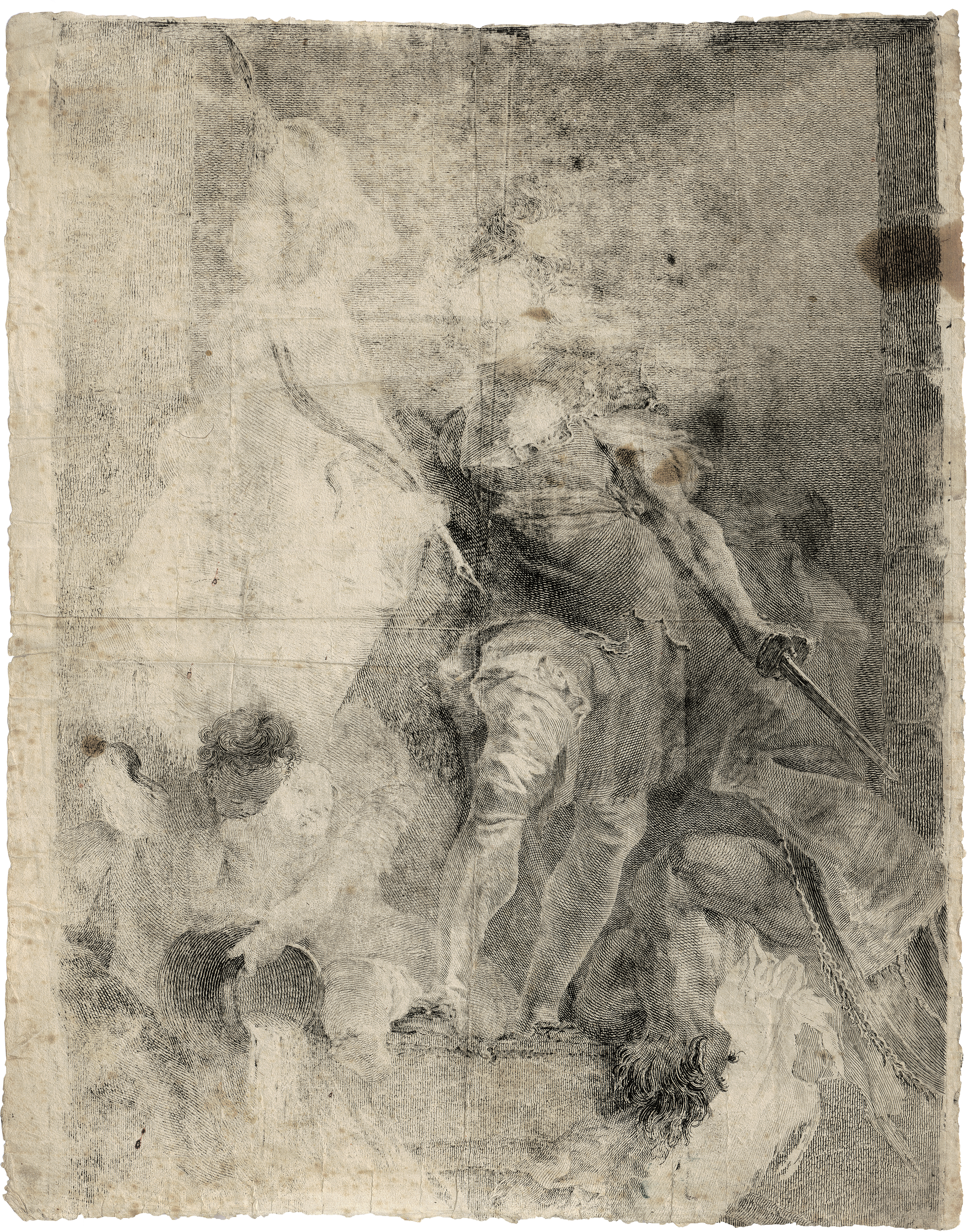 Das seltene Motiv des "hl. Florian als Krieger" geht auf eine Bilderfindung von Franz Anton Maulbertsch zurück. Die Wiener Albertina bewahrt eine Federzeichnung (Inv. 43799), die wohl als Vorlage für die Ausführung in Öl diente. Eine Ölskizze in der Sammlung des Unteren Belvedere in Wien (Inv. 2329), die dasselbe Motiv zeigt und lange als von der Hand Maulbertschs galt (s. Klara Garas: Franz Anton Maulbertsch, Wien 1960, S. 213, Nr. 189), wird jetzt als Werk eines unbekannten Künstlers geführt, weshalb die eigenhändige Ölskizze Maulbertschs, auf die unsere Radierung zurückgeht, wohl als verschollen gelten muss. Die furiose Radierung nach der Maulbertsch'en Komposition wird in der älteren Literatur von Nagler und Le Blanc dem Künstler selbst zugeschrieben. In der jüngeren Forschung sind jedoch Zweifel aufgekommen und das Blatt wird heute teils als ein Werk des Maulbertsch-Schülers Johann Beheim (tätig 1762-1770 in Wien, Mailand und Rom) geführt, dessen druckgraphisches Œuvre ebenso rar und gesucht ist wie das seines Lehrers. Bei unserem höchst experimentellen Abzug handelt es sich um einen singulären Probedruck von der unvollendeten Platte, den der Künstler auf einen vollen, für die Druckplatte jedoch etwas zu kurzen Papierbogen gedruckt hat. Insbesondere die für die Komposition relevante Partie, nämlich das Gesicht des Heiligen ist noch nicht angelegt und erscheint als weiße Leerstelle, ebenso wie größere Teile der den Speer umgebenden Draperie. Der Abzug diente also als ein Arbeitsmittel für den Stecher, der sich Gewissheit über die weiteren Arbeitsschritte verschaffen wollte. Entsprechend wurde bei der Herstellung des Drucks weniger Wert auf die Qualität des Abzugs oder die Wahl eines passenden Papierformats gelegt. Auch die Werkstattspuren wie die ölhaltigen Flecken zeugen von dem Charakter als Arbeitsmittel. - Ausgezeichneter, etwas ungleichmäßiger Druck, rechts und links mit Rändchen, oben mit der Plattenkante, unten die Darstellung vom originalen Papierrand überschnitten. Horizontale und vertikale Mittelfalte, weitere zahlreiche Knitterfältchen, stockfleckig und mit vereinzelten Ölflecken, weitere Gebrauchsspuren. Laut Annotation des beiliegenden Untersatzes aus der Sammlung des Wiener Kunsthistorikers Ludwig Münz (1889-1957) und aus der Sammlung Wolfgang Trauwitz, Stuttgart (1927-1970), verso mit dem Stempel der "Zentralstelle für Denkmalschutz im Bundesministerium f. Unterricht". Von großer Seltenheit, wohl Unikum.