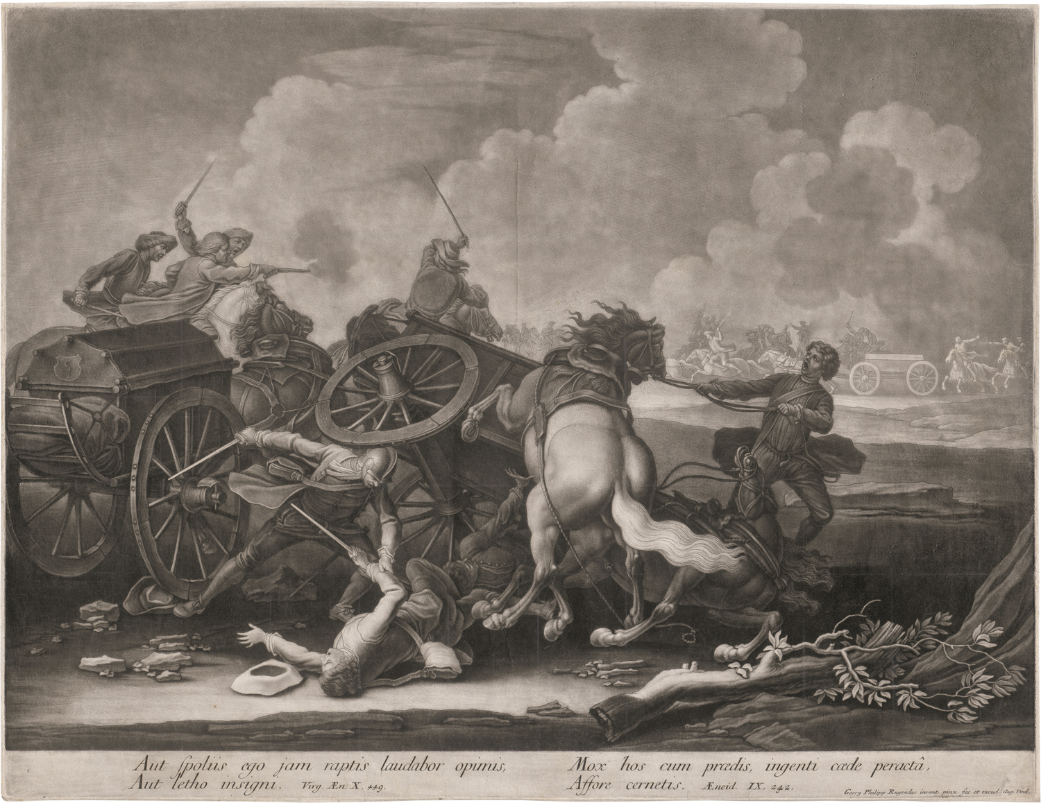 Eine Folge mit sechs Schlachtenszenen und Versen aus Vergils Aeneis. 6 Schabkunstblätter mit Radierung. Je ca. 52 x 67,4 cm. Meusel 1803, S. 97f, Teuscher 76-81. Wz. Schrift unter Krone, Nebenmarke.