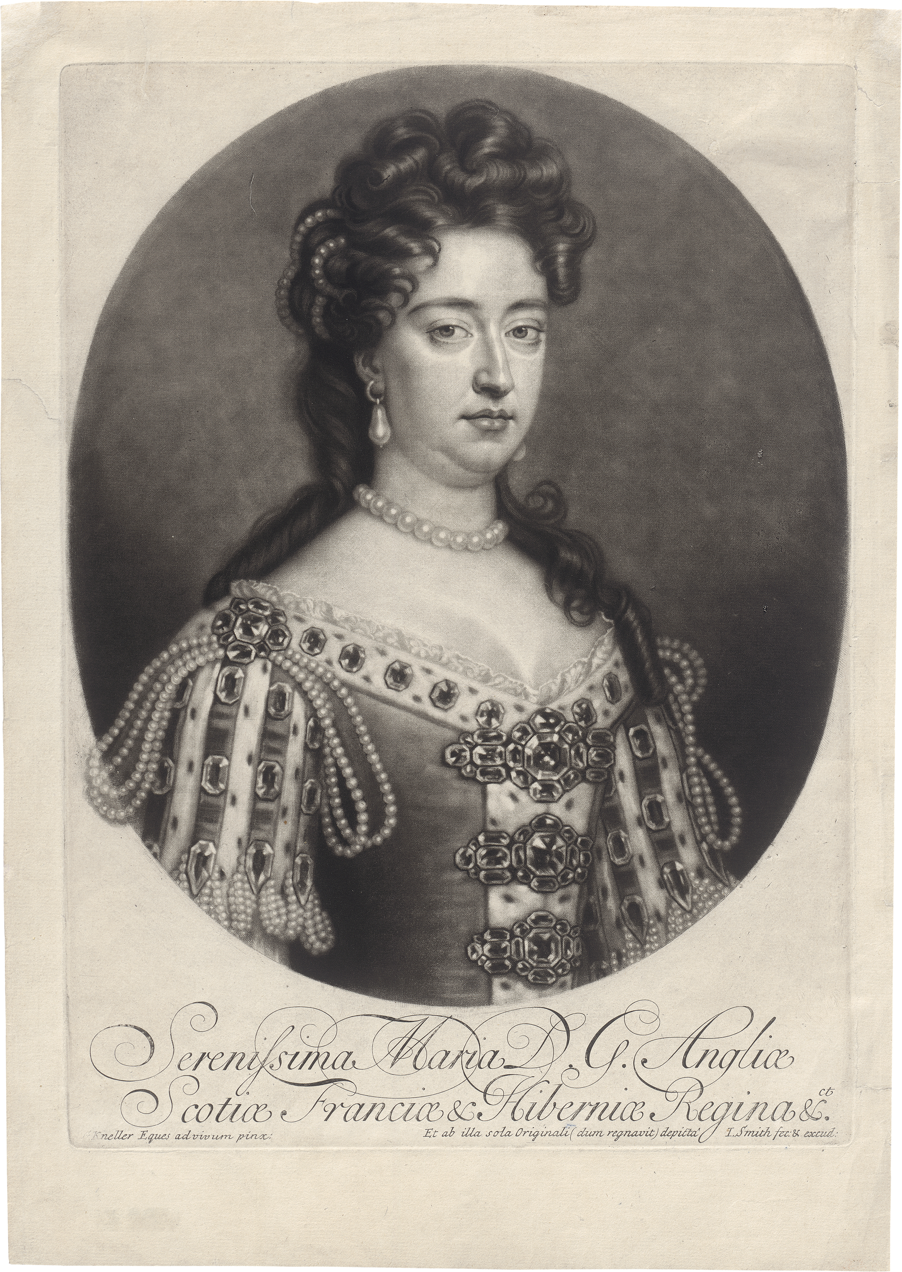 Bildnis Jacob II. von England; Bildnis der Königin Mary II. von England. 2 Schabkunstblätter nach Sir Godfrey Kneller. Je ca. 34,1 x 24,8 cm. Um 1695 bzw. 1697. Chaloner Smith 143 II und 172 II. Wz. Bandenwappen mit Lilie, bzw. Nebenmarke.