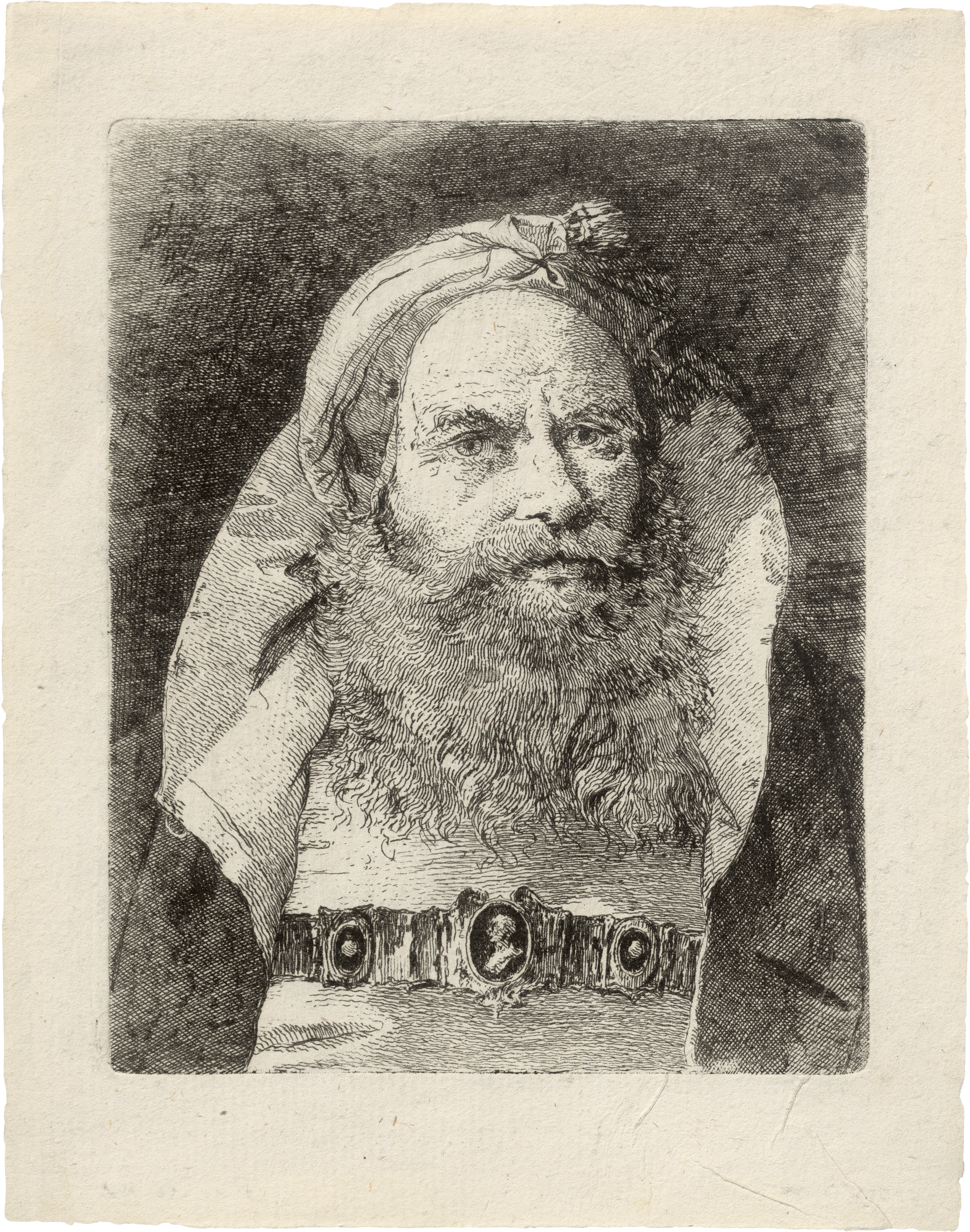 Kopf eines bärtigen Alten nach rechts gewendet. Radierung nach Giovanni Battista Tiepolo, aus der Folge Raccolta di Teste, wie auch die folgenden zwei Losnummern. 13,9 x 11 cm. Um 1757. De Vesme 122, Rizzi (1970) 162, Rizzi (1971) 166 I (von II), Succi 101 I (von II).